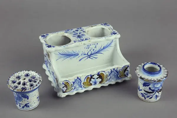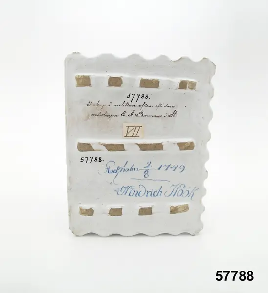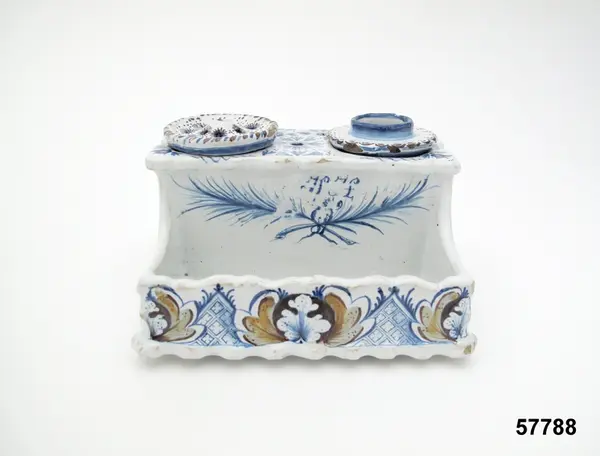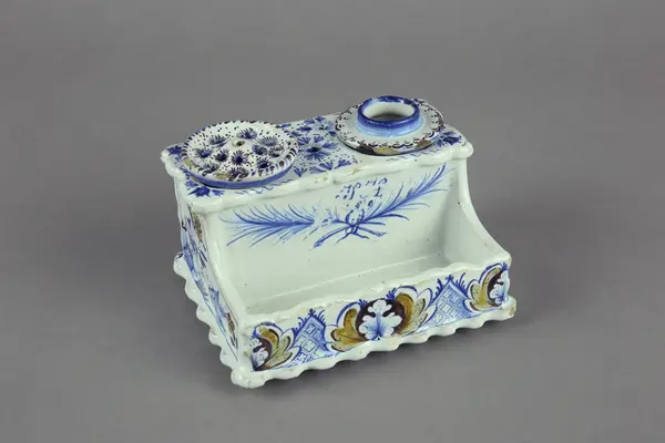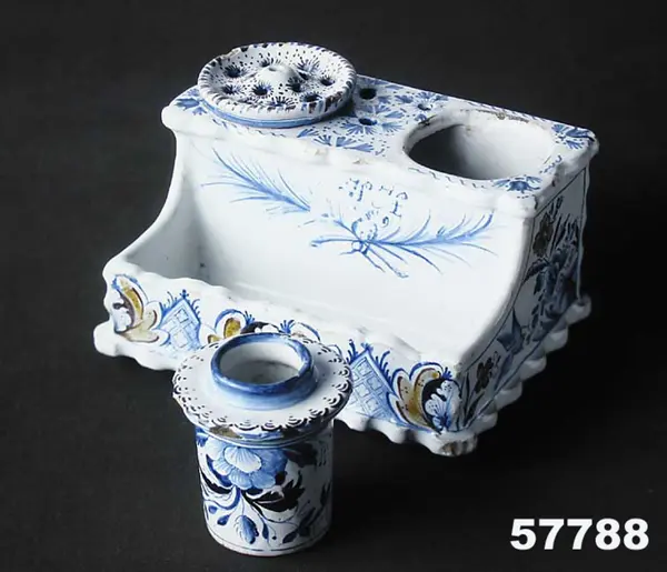 "Skrivtyg. 'Skrivlåda' med bläck- och sanddosa samt framtill ett rum för pennor; prytt med blommor och rutmönster i blått, brunt och gult, på framsidan två palmkvistar varöver 'H.H.' Sign: 'Stockholm 2/8 1749 Hindrich Höök'. Sand- och bläckhorn kantstötta".