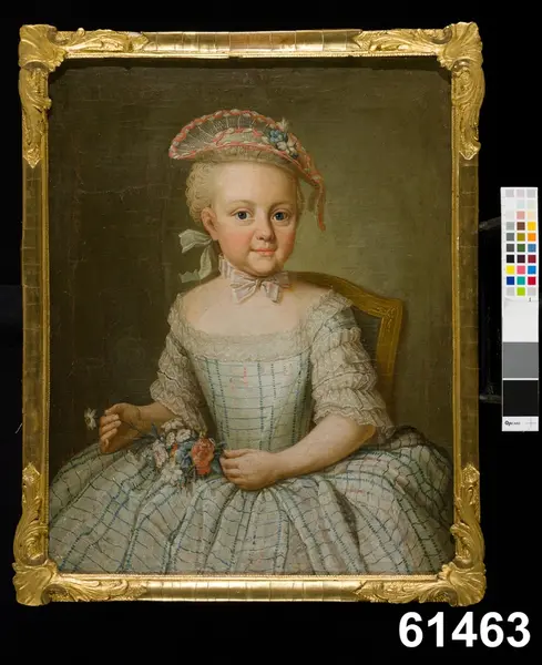Flickporträtt i olja på duk, föreställande Jacobina Carolina Schultzen vid 4 års ålder 1767. Jacobina är avporträtterad som en vuxen elegant dam. Den lilla barnkroppen är intvingad i ett snörliv, klänningen med spetsar och rosetter följer vuxenmodet och på det pudrade håret sitter en stråhatt.