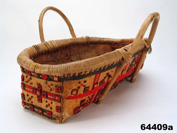 a: Dopkass av flaknäver med handtag. Kassen - korgen - har en långsmal form. Flera lager av näver har sytts ihop med rottågor. Botten med stjälksöm, sidor och gavlar med klyvsöm. Under klyvsömmen ligger en vadmalsremsa som förstärkning och dekoration. På kassens övre långsida finns en "krage", ca 7 cm bred, i nedre kanten följer en röd vadmalsremsa. Kanten har en kluven vidja lagd på ut- och insidan av sidoväggen. Vidjan är fäst med en tät lindning av rottågor, i kanten på utsidan följer en smal brun och röd vadmalsremsa. Sidohandtagen består av en bågformad käpp, varav ett har lossnat helt. Den andra är fastsurrad i ena änden och i kassens kant. Kassen är dekorerad med "vadmalsnoppor", som är placerade i grupper av fem styck. Små fyrkantiga bruna, röda och gula vadmalsbitar, den ena lagd på den andra, är fastsydda med lintråd som löper i kassens insida. Gavlarna har inristad dekor i form av diagonala ränder som bildar ett rombmönster över hela ytan.