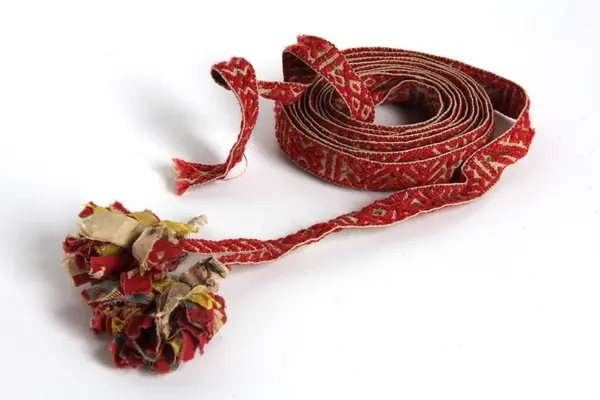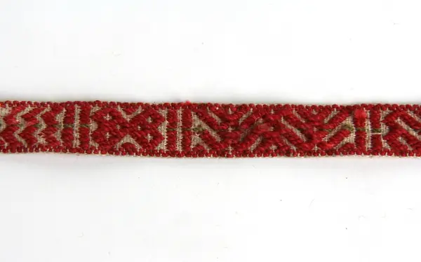 b: Mönstervävt band, "krusband", med tofsar, "tuppor" i en änden. Varp: rött ullgarn och oblekt lingarn med grön mittbård. Inslag: oblekt lingarn. Bandet har varierande mönsterformer avdelade med stolpar. I ena änden har varpen delats och avslutats med två styck fyra cm långa tofsar av tygremsor i bl a kattun och siden. Den andra änden saknar tofs.