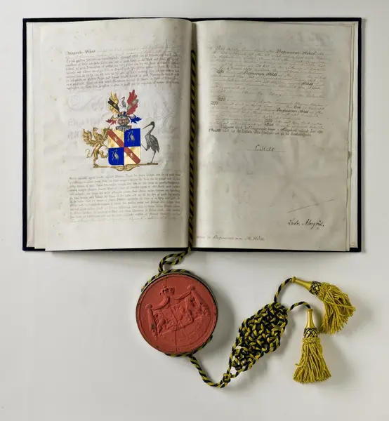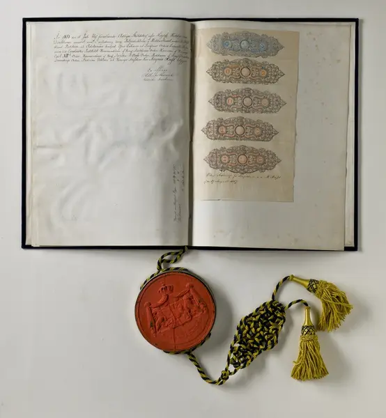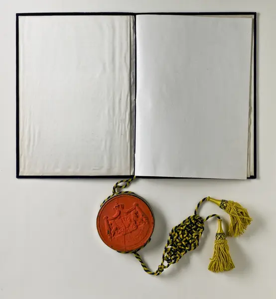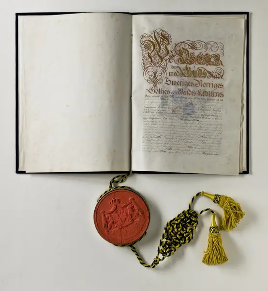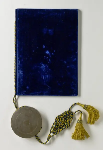 "Pärm till sköldebrev, blå sammet, sigill i metallkapsel, blågul snodd o tofsar. Sköldebrev för Magnus Huss utf. av Oscar I, dat. 29.8.1857. G. gm fru Lotten Huss f. Bergenstråhle, Stockh. 29/1 1891."