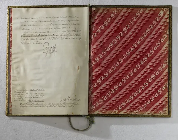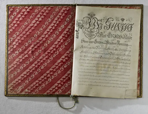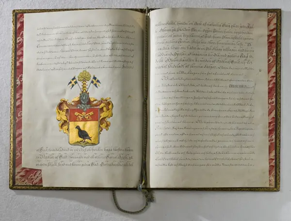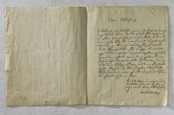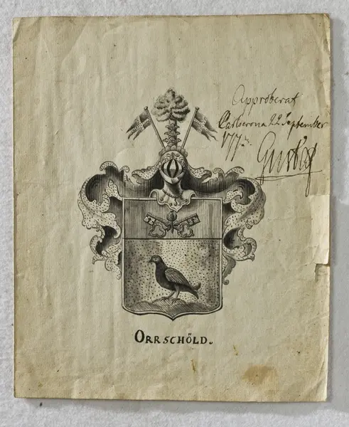 "Sköldebref. För Öfwerkommisarien wid Amiralitetet Lars Orrschöld, samt Capitainen dersammastädes och Riddaren Samuel Orrschöld, dagt. 22 Septembris 1773, med Gustaf III:s namnunderskrift. På pergament i prässadt läderband. Jämte vapenbeskrifning på papper, äfvenledes med Gustaf III:s namnteckning. En bit afklippt af ett hörn. Ink. hos ant.handlaren A Matsson i Stockholm = 30 kr. 27/2 1891."
