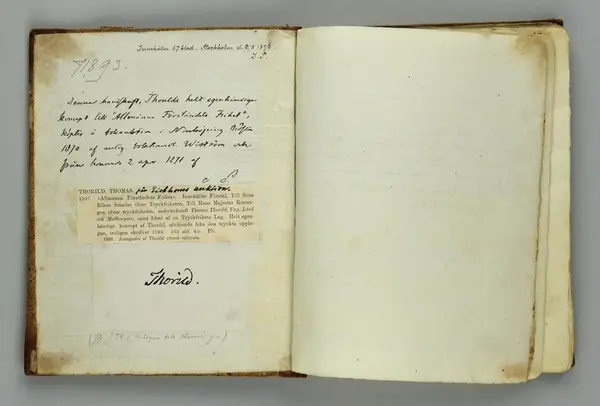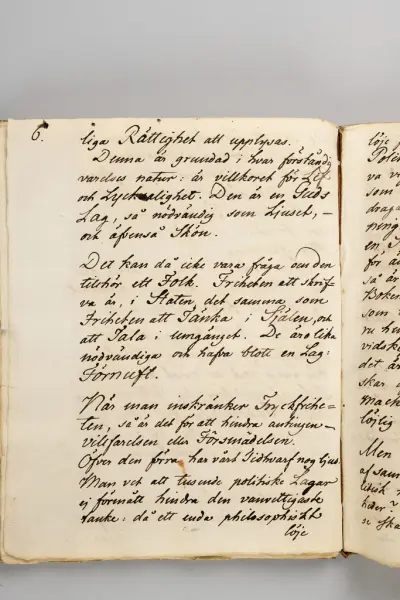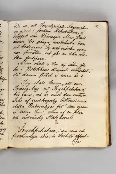 ""Allmänna Förståndets Frihet" av Thomas Thorild. Innehåller Företal, till Svea Rikes Ständer öfver Tryckfriheten, Till Hans Majestät Konungen öfver Tryckfriheten, undertecknadt Thomas Thorild, Ung, Lärd och Medborgare, samt Ideal af en Tryckfrihets Lag. Helt egenhändigt koncept af Thorild, afvikande från den tryckta upplagan troligen skrifvet 1786. 103 sid. 4:o Pb. Obs. Autografer af Thorild ytterst sällsynta."