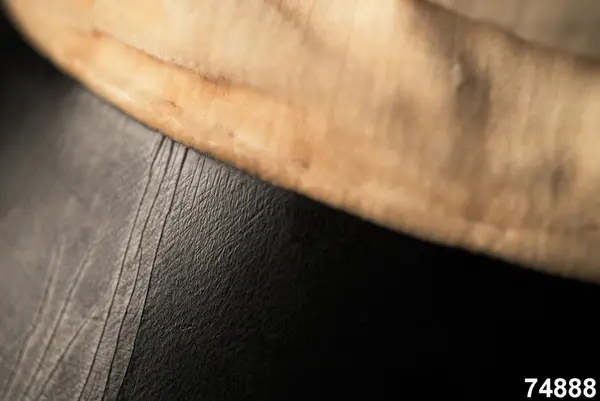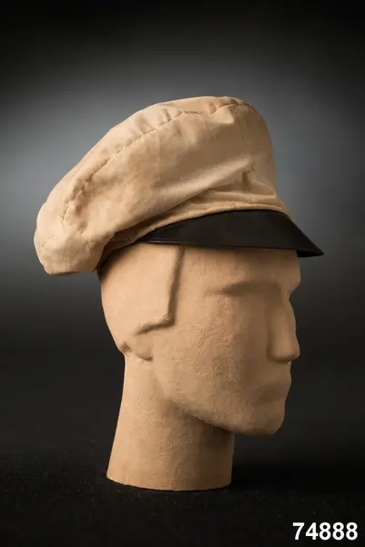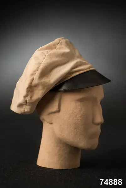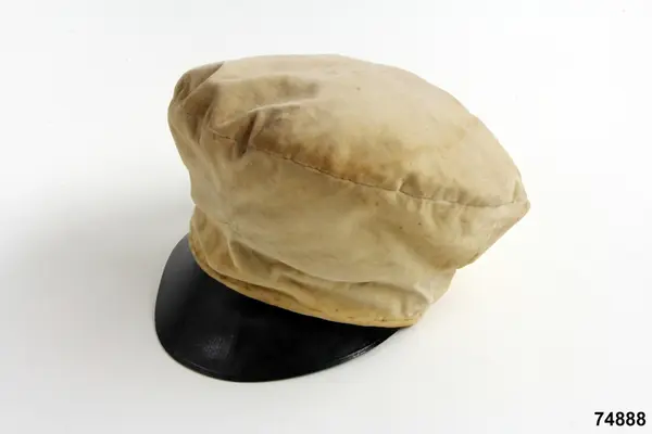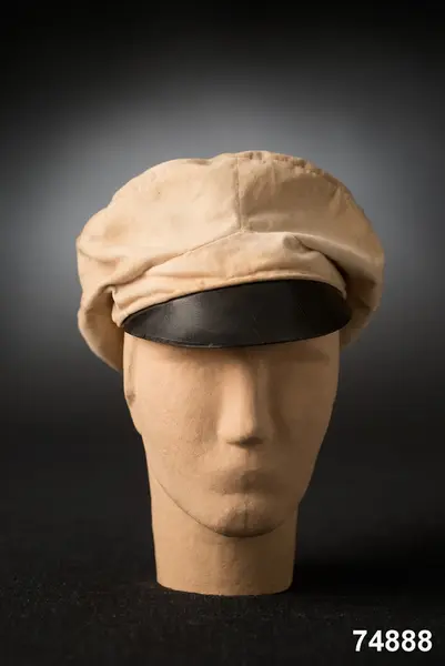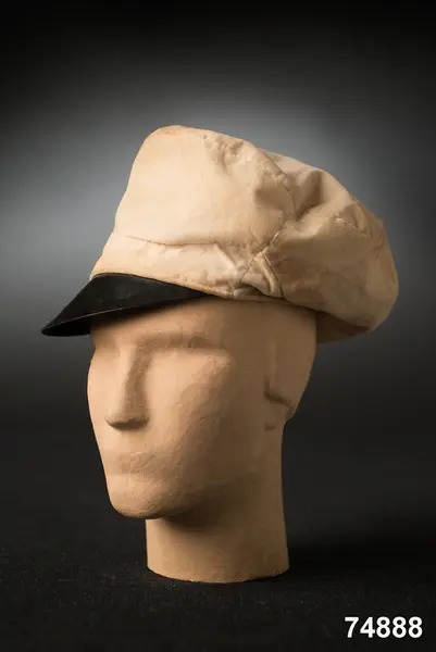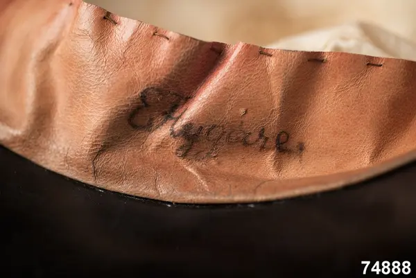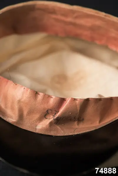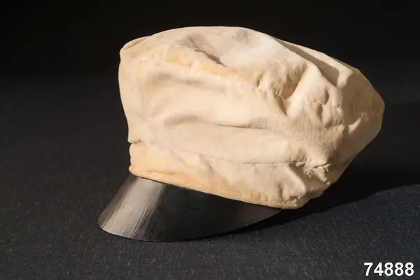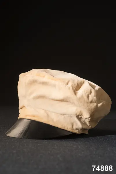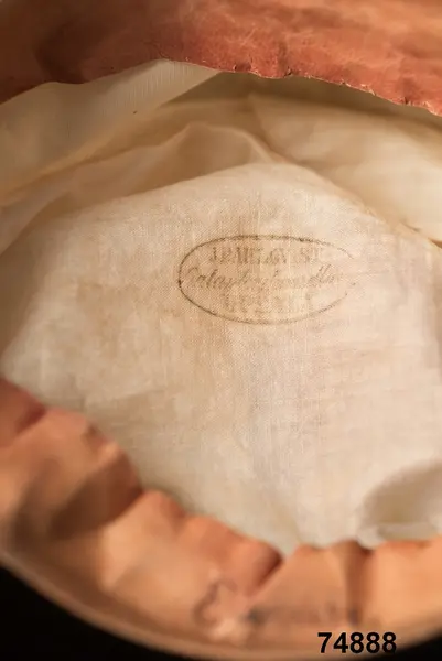 Av hvit silkessammet (numera gulnad), med skärm af svart vaxduk. Kokard och band saknas. Foder af hvitt bomullstyg med oval tryckt stämpel: ”J.P.AHLQVIST Galanterihandl… UPSALA”. Svettrem af röd saffian, märkt E. Flygare.