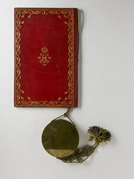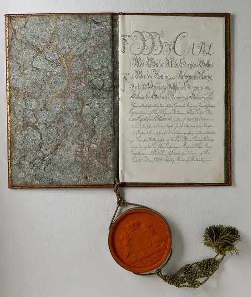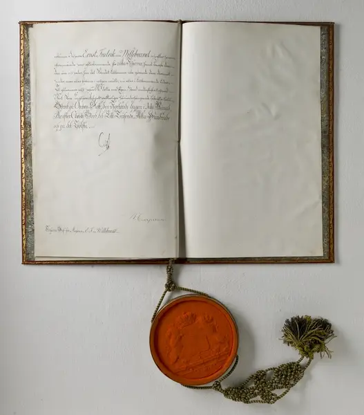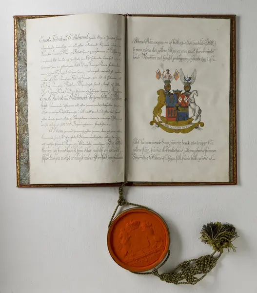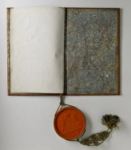 "Pärm till friherrebrev. 1812. Statlander F.W [pärm]. Röd marokäng med guldprässningar, även utmed kanterna av pärmens insidor. Sigill i metallkapsel, hängande vid blågul silkessnodd, knuten och med tofsar. Bandet sign: ' Inb: hos F.W. Statlander' inom oval. Friherrebrev för 'Majoren E : F : von Willebrandt'. Dat. 14 juli 1812 o. underteckn. Carl. Jfr. Sv. bokb. III fig. 2. Ink. å auktion eft. v. häradsh. O.A. Beckman i Stockh. 29/4 1893."