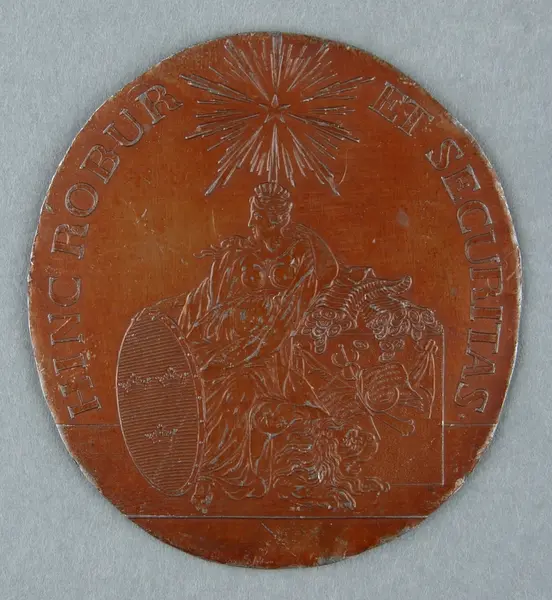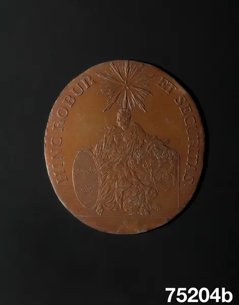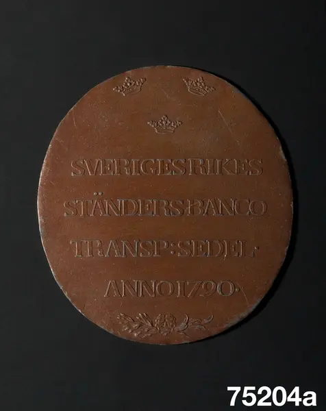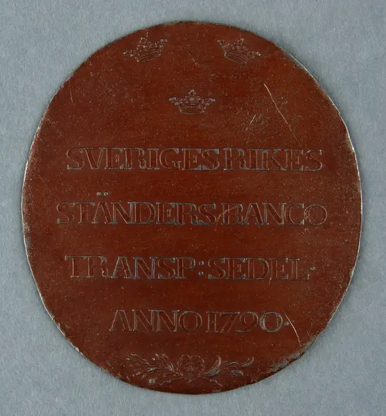 "Aftryck. I bronseradt bly af stämplarna till Rikets Ständers Banks Transportsedlar 1790. a) märkt 'SVERIGES RIKES STÄNDERS BANCO TRANSP: SEDEL ANNO 1790. b) 'HINC ROBUR ET SECURITAS'. Ink. hos antikhandl. H. Bukowski i Stockholm."