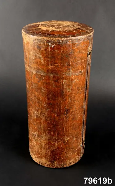 Hit hör ett cylindriskt fodral af trä klädt med brunt glättadt skinn och orneradt med inprässade förgyllda rankor m.m. i stil från senare hälten af 1700-talet. Med två mässingshakar. Invändigt fodradt med ljusrödt sämskskinn."