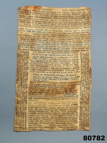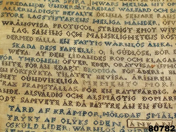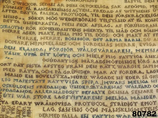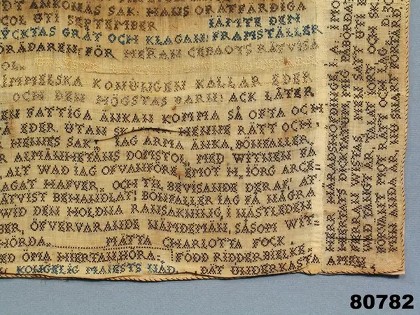 "80782 Klagoskrift. H. 0,73. B. 0,478. Af Mätta Charlotta Fock, f. Ridderbielke, dagt. 'Jönköpings Bastil den 10 Desämber 1805'. Sydd med korsstygn å stramalj, inom glas. Mätta Charlotta Fock, f. Ridderbielke, f. 1765, dömdes år 1810 att mista högra handen, halshuggas och å bål brännas, för det att hon förgiftat sin man, sergeanten Henrik Johan Fock, och två af sina barn. Se Anrep, G.: Svenska adelns Ättar-taflor I, sid. 843, tab. 26. Gm testamentariskt förordnande af friherrinnan S. Adlersparre, f. Leijonhufvud i Stockholm. 28/9 1895."