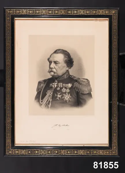 "Tavla, porträtt, litografi. Porträtt föreställande Johan August Hazelius (1797-1871), bröstbild, bär uniform. Tryckt text under bilden till höger: 'C. A. Carlssons Lith. Tr. Stockholm'. Tryckt text under bilden mitten: 'Joh. Aug. A. Hazelius *1797 +1871'. Handskrivet längst ner i vänstra hörnet: 'Till herr Aug. Schumburg af Artur Hazlius'. A. T.: 'G. af konsul R. Schumburg'.