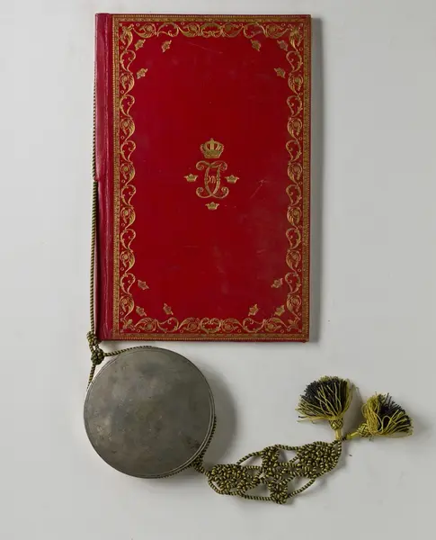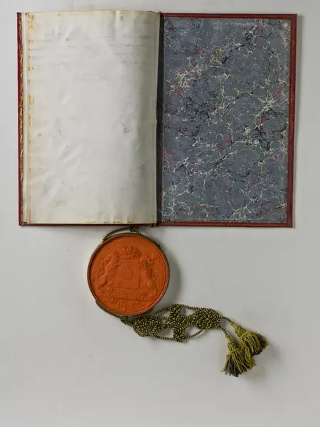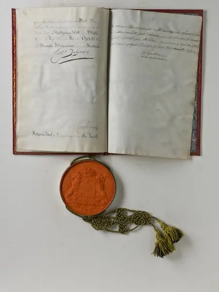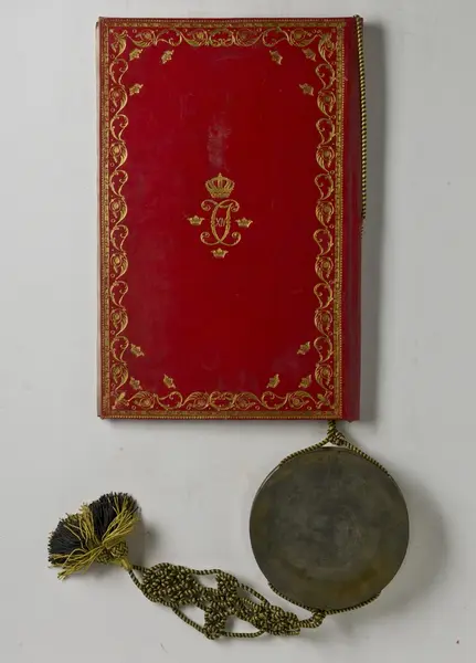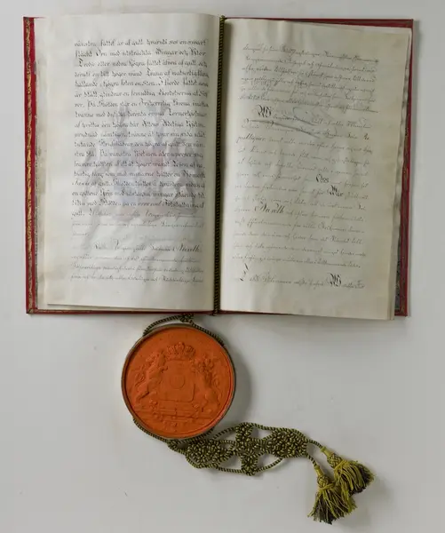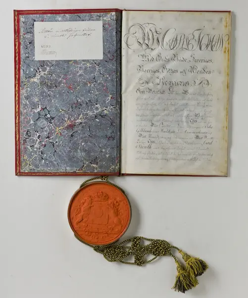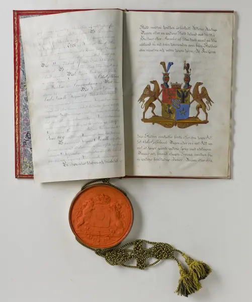 "Friherrebref för landshöfdingen B.A.C. Nieroth. Diplom i fol. format å 4 blad pergament med vapenbild, dagtecknadt d. 11 maj 1818 och undertecknadt af konung Carl Johan. Bundet i röd marokäng med guldprässningar. Med vidhängade kungligt sigill i kapsel med lock af hvit metall (tvärmått 0,185). Baltzar August Carl von Nieroth, landshöfding i Linköpings län. G. af konsthandlaren H. Bukowski i Stockholm 24/10 1898."