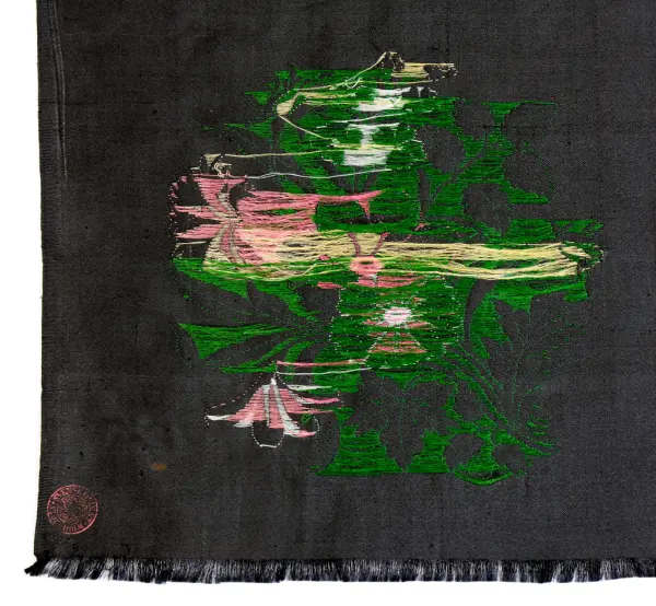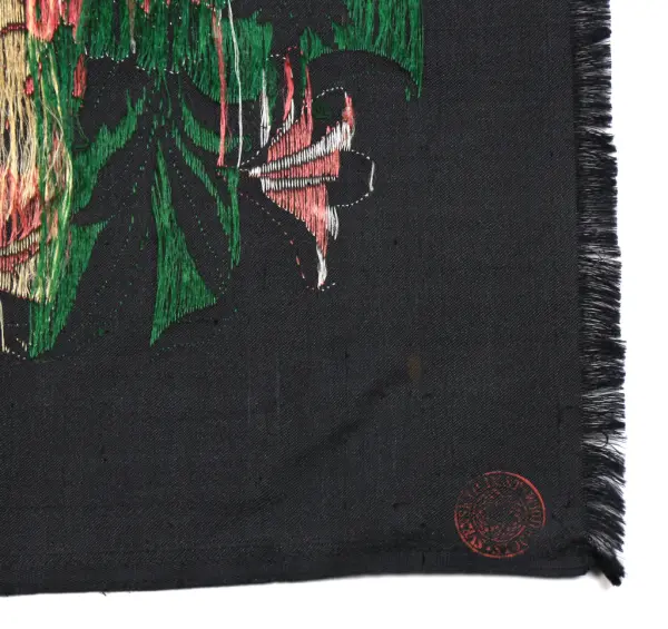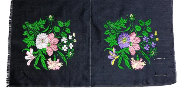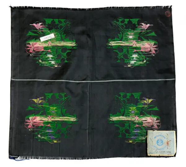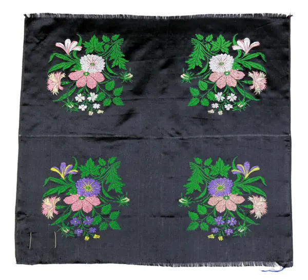 På svart botten två par speglade buketter avpassade för bindmössor. Gröna blad, blommor i vitt, rosa och beige i ena paret, i andra paret blommor i violett, gult, rosa och beige. Mellan mössstyckena en vit rand. I stadkanten, längst upp och längst ner, spår av röda trådmarkeringar (för att markera antal stycken vid vävningen?)