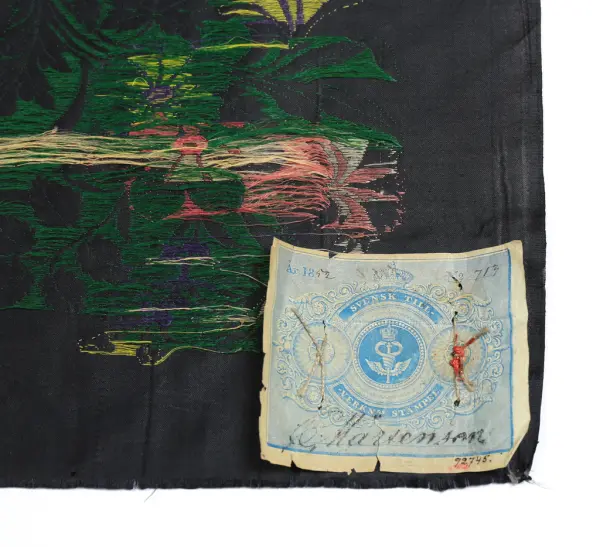 I ena hörnet finns en pappersetikett fäst med lintråd där den ena knuten har spår efter ett lacksigill. Tryckt bild i ljusblått/vitt med texten: "Svensk tillverknings Stämpel År 1852 No. 713" samt med handskrift C G(?) Mårtenson. I ett annat hörn finns på baksidan en tydlig hallstämpel i rött med texten:" Svensk tillv.st. Stockholm.