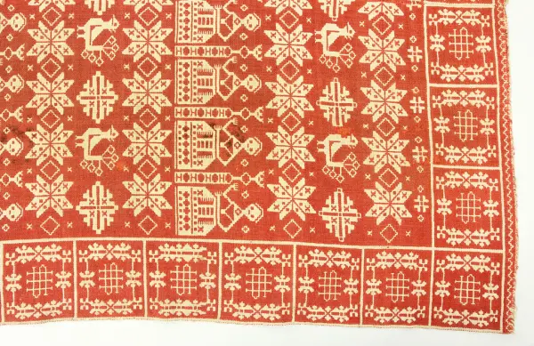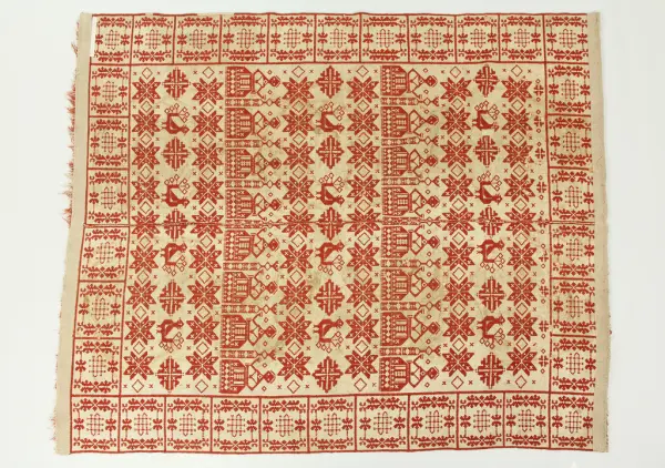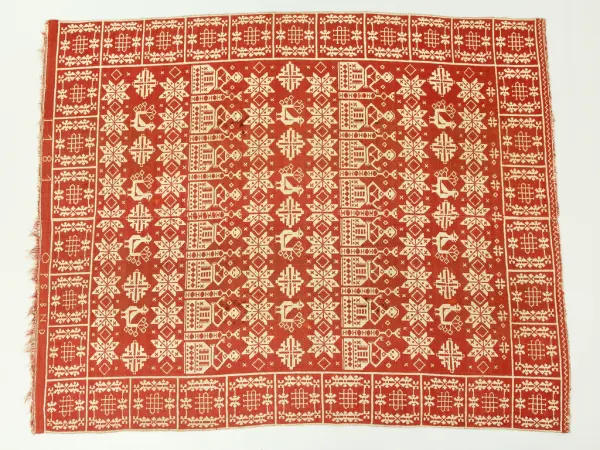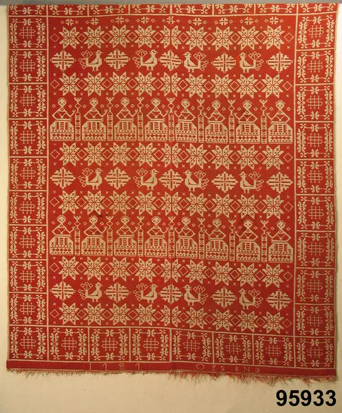 "95933 Täcke, finnvävnad i rött och grått. Från Barkeröd. Bohuslän, Inlands Södre hd, Romelanda sn. Ink. 28/9 1903 Gm amanuens A. Nilsson, Sthlm. 25:- Nilsson 169. Bil."