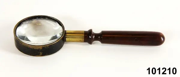 "Förstoringsglas. Fattningen av svartlackerad mässing, skaftet av trä, med dubbla biglas +13,2 dptr, runda 48 mm. På fattningen ingraverat Johan Spångberg. 101.210. – Har tillhört Ivan Spångberg (1800-1888), professor. – Gåva av lektor V. Knös, Uppsala, år 1804.