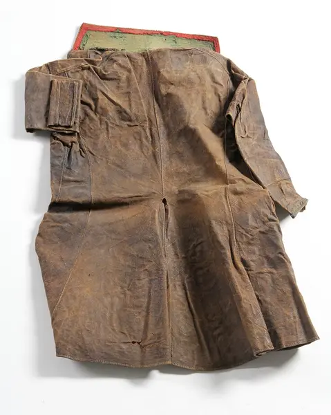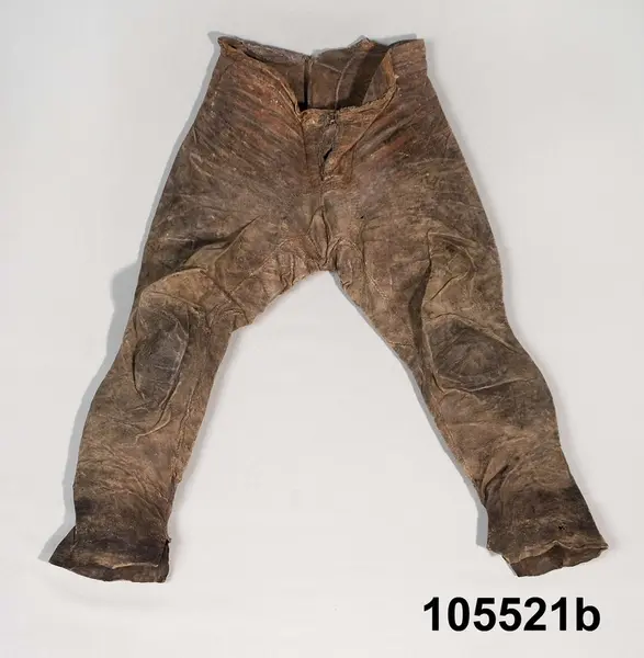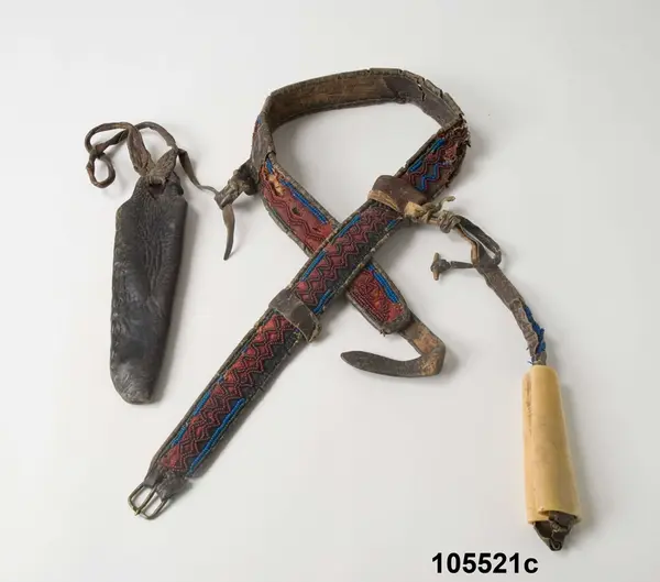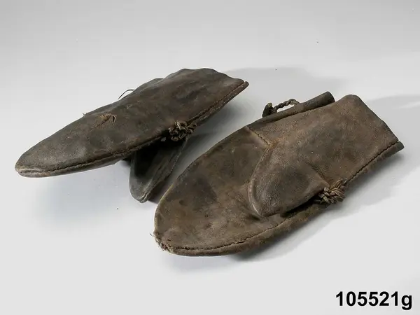 "a-g, Lappdräkt för man, av skinn, bestående av rock, byxor, bälte, pjäxor, bröstlapp, mössa, vantar. Oviksfjäll."