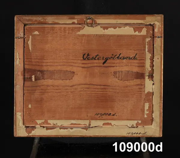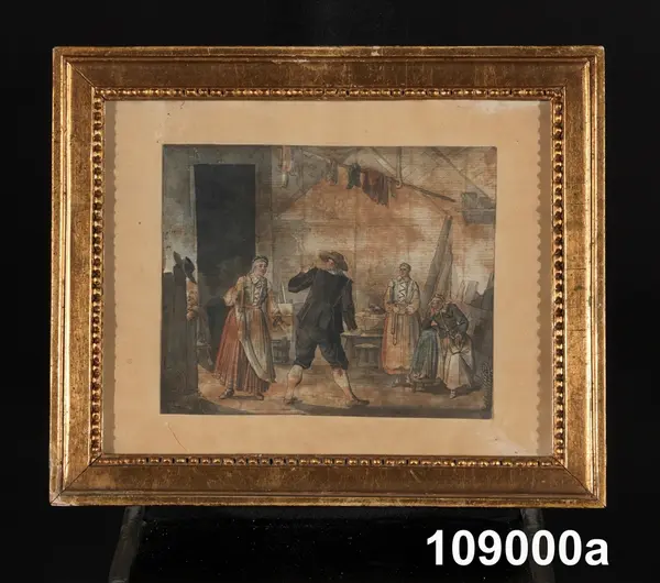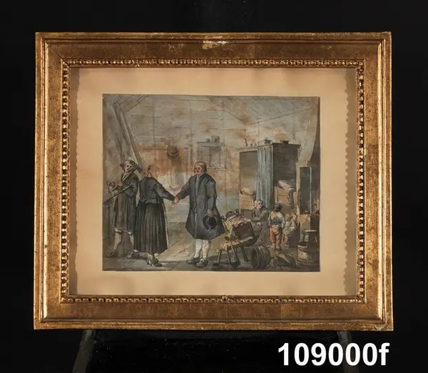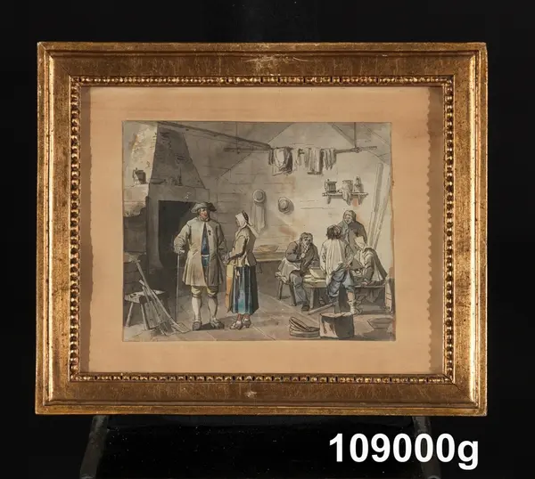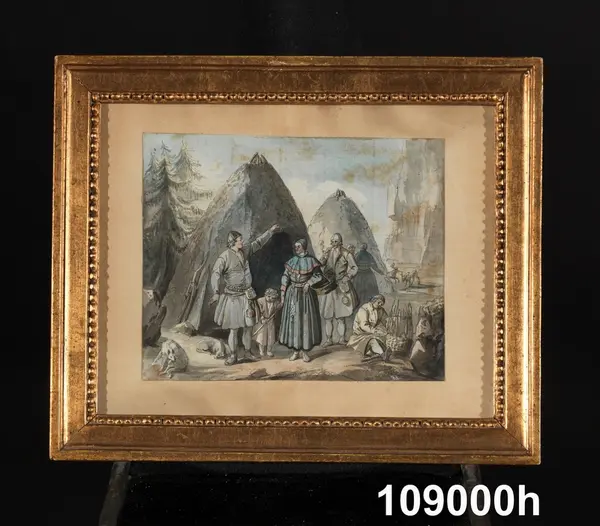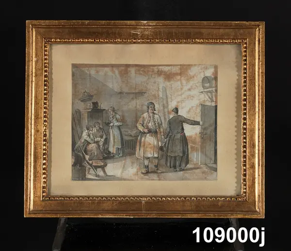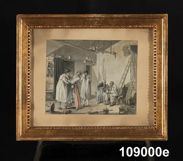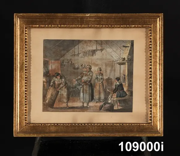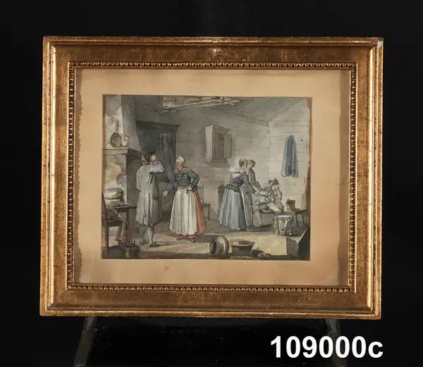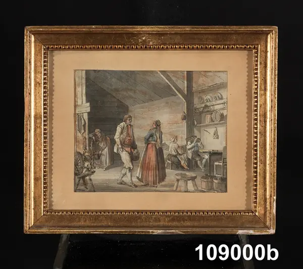 "Konturetsningar, akvarellerade, av J F Martin efter förlagor av Pehr Hilleström d ä, med allmogemotiv. Folklivsskildringar från skåne 1, Blekinge 1, Småland 1, Södermanland 1, Västergötland 1, Dalarna 1, Lappland 1, och 2 från Finland, tillsammans 10. Förgyllda originalramar.