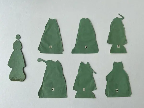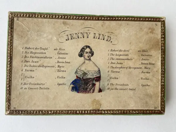 Pappersdocka av kartong fodrad med grönt papper, tryck och handkolorerad, föreställande den svenska sångerskan Jenny Lind (1820-1887), som slog igenom stort på 1840-tal. Dockan ligger i sin originalkartong tillsammans med en fotställning av kork och tio kolorerade dräkter.
