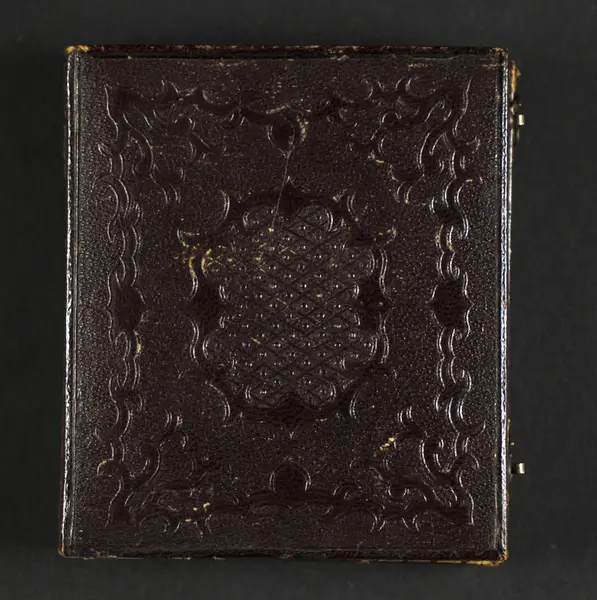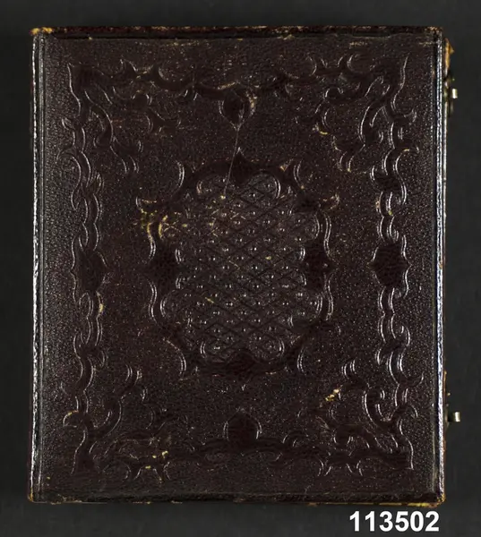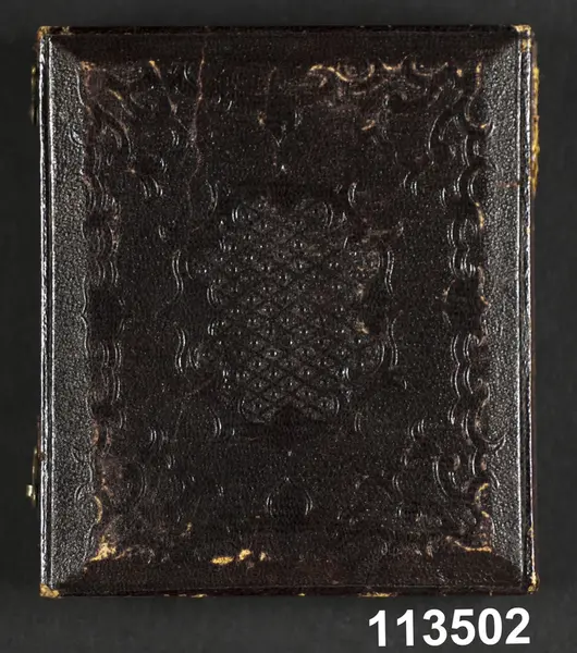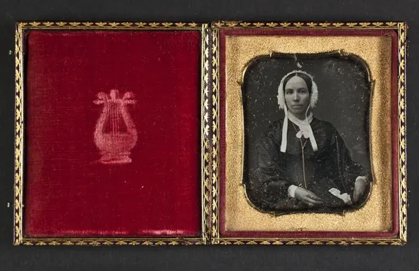 "Daguerrotypiporträtt av okänd dam i vit mössa, i brunt maroquinfodral, 1800-talets mitt. Av säljaren inköpt å auktion i Drottninghuset. Ink. 21/5 1909 från porslinsreparatör C.J. Wiberg, Stockholm."
