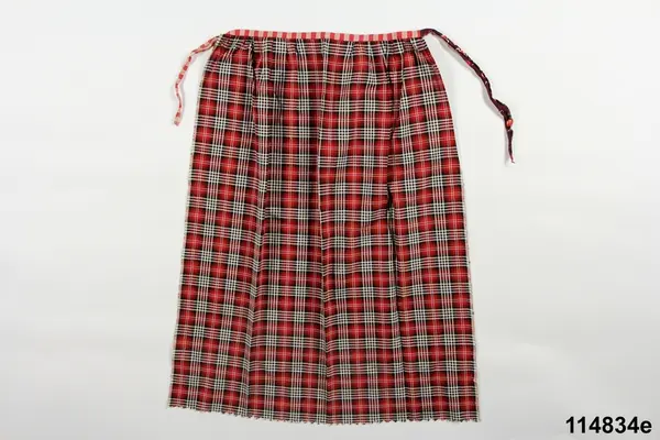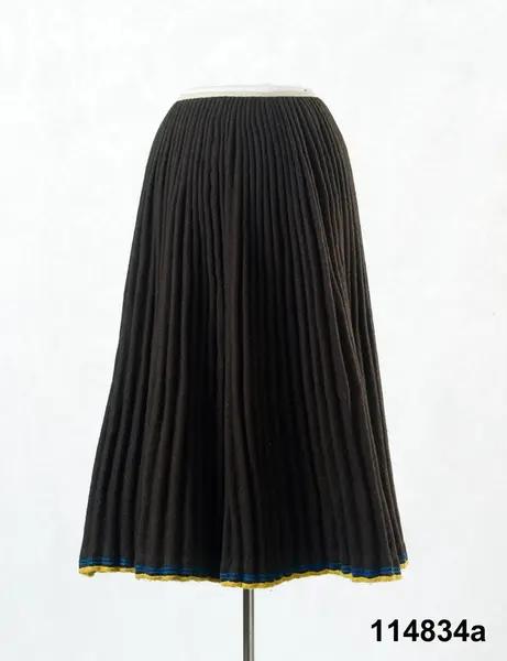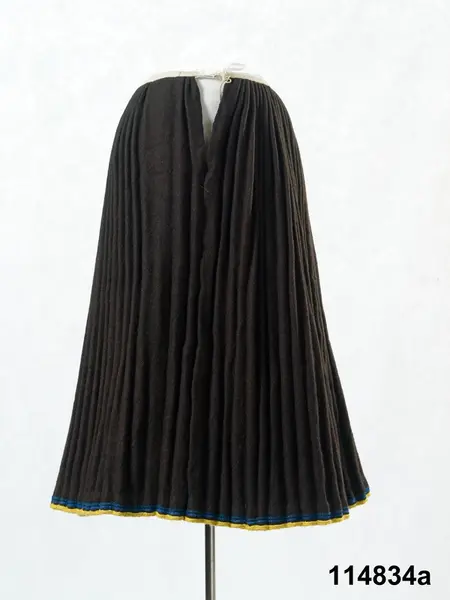 a. Kjol. längd 84 cm, vidd 200 cm. Av brunsvart tjock vadmal, helgoffrerad, midjelinning av linnelärft med sprund, knytband av linsnöre. Nederkanten fållad och skodd med gul yllesnodd och 2 rader kedjesöm med blått ullgarn i olika nyanser.