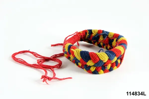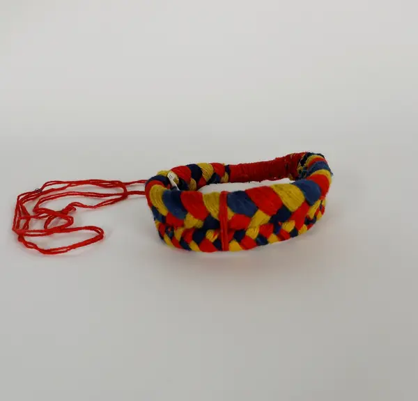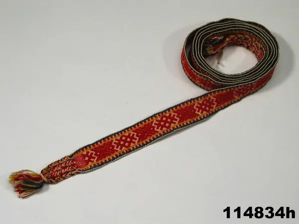 Botten av vitt bomullsgarn, uppplockat mönster i rött ullgarn med gröna kanttrådar, geometriskt med snedstreck och snedrutor. Avslutat i ändarna med 4 flätor av varpen som ytterst hålls ihop i en tofs.