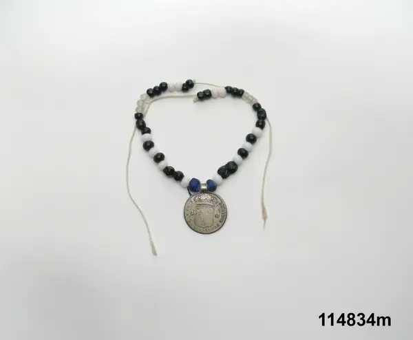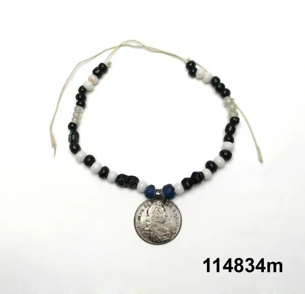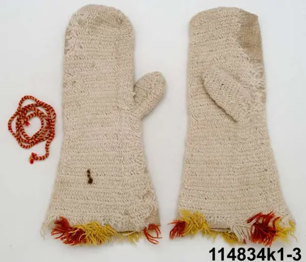 k. Tumvantar, längd 37 cm, i nålbindning av vitt ullgarn, lång krage avslutad med en frans i rött, gult och vitt ullgarn.