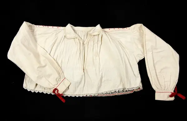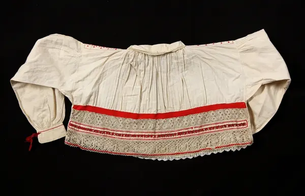 Av vit bomullslärft, livet goffrerat på längden, nedre delen under ärmmarna består av 2 rader knypplad spets, hålsömsbroderi i rött samt infällda röda ylleband, axelförstärkningar med plattsömsbroderier av rött bomullsgarn, ståndkrage och halssprund kantade med vävd spets, vidsydd ärm med ärmspjäll och veck på kullen, nedtill rynkade mot ärmlinning.
