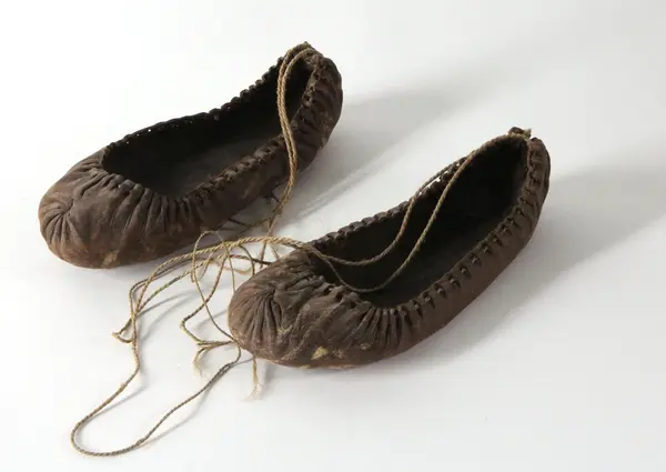 j: 1-2 Skor. längd 25 cm. Av brunt skinn med fragment av heårrem, ett stycke som vikts upp mot foten och dras ihop med en snodd troligen av hampa, trädd genom uppslitsade hål runt ringningen.