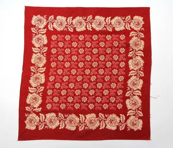 d. Halskläde, längd 73 cm, bredd 77 cm, av tunn tät bomullslärft med tryckt mönster i vitt på turkröd botten, bård med stora blommor och blad, i spegeln ytmönster med små blommor och kvistar, maskinsydda fållar, 2 stadkanter.