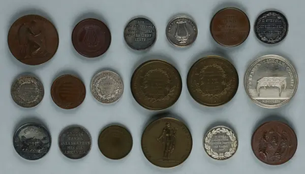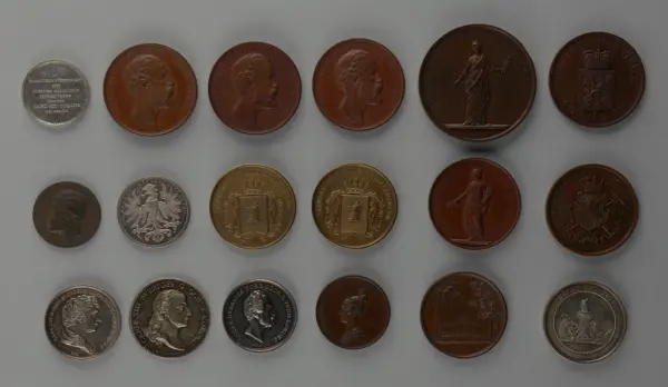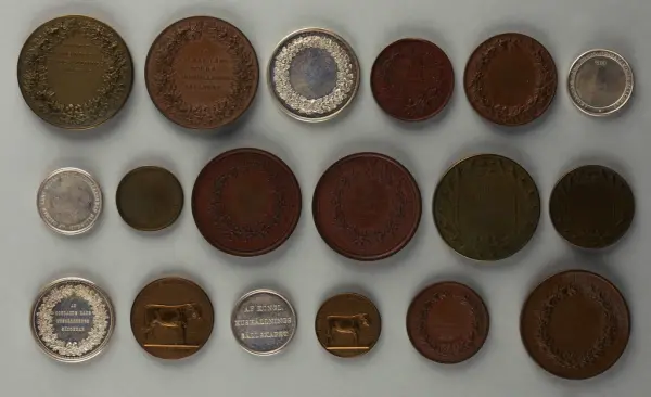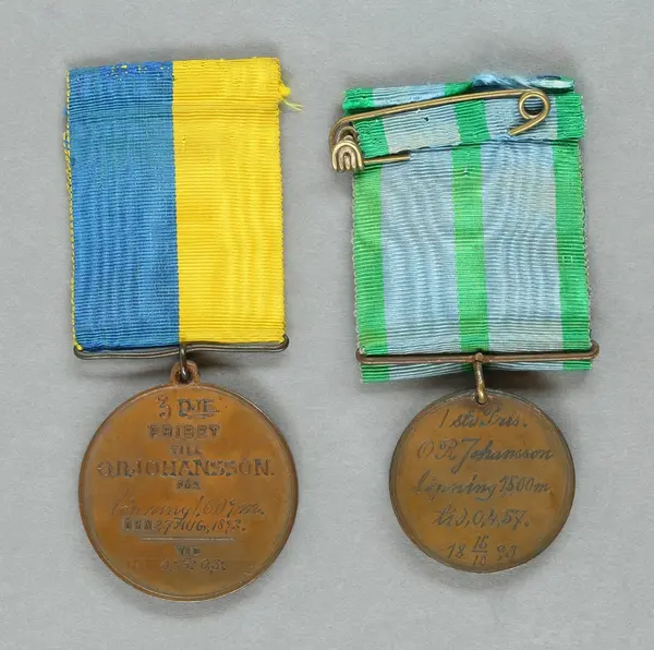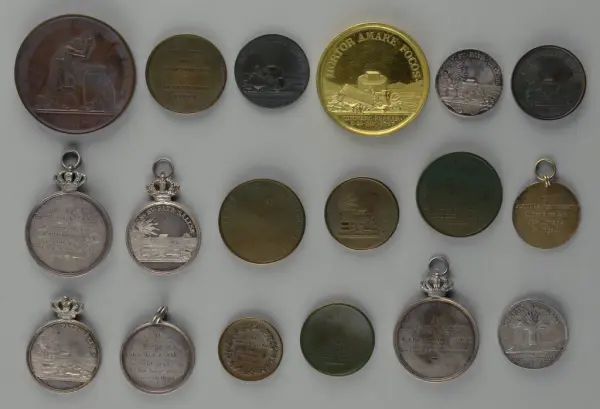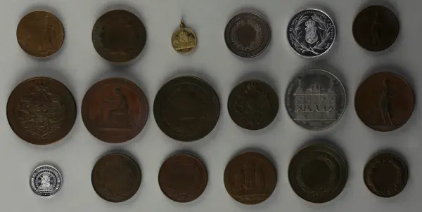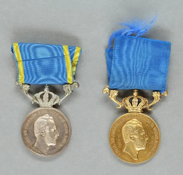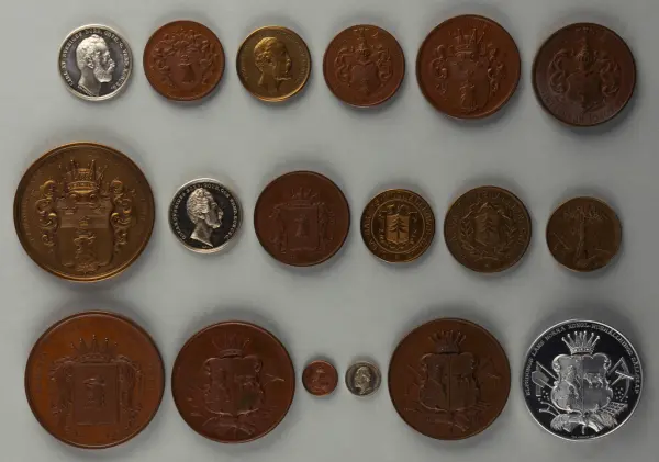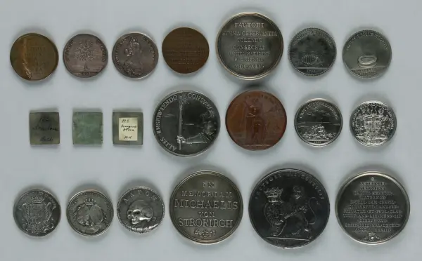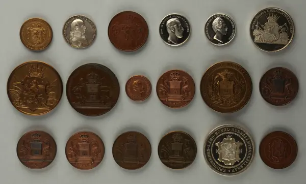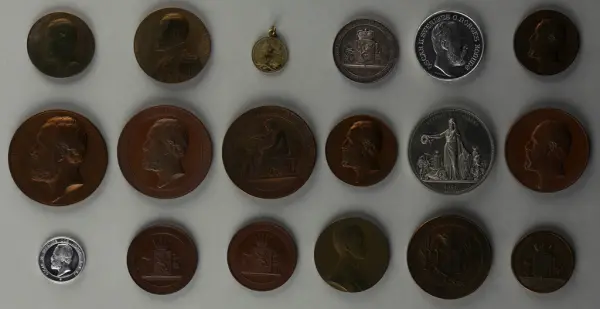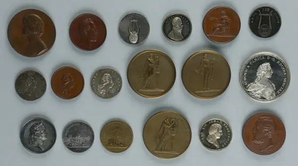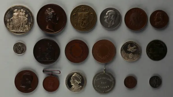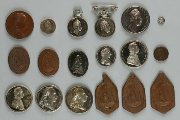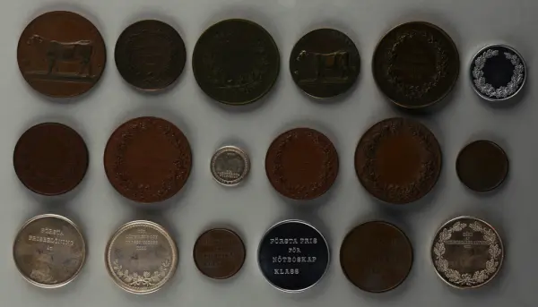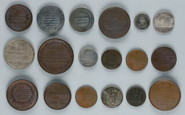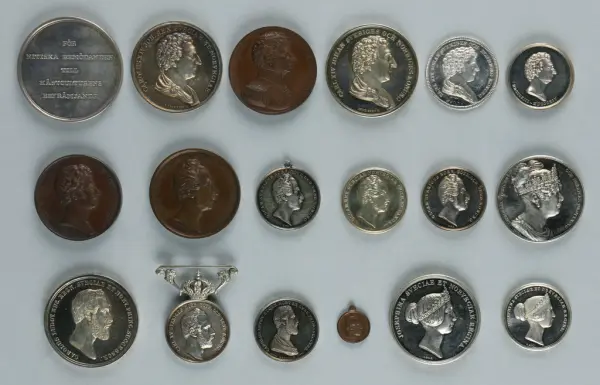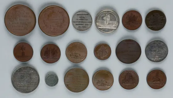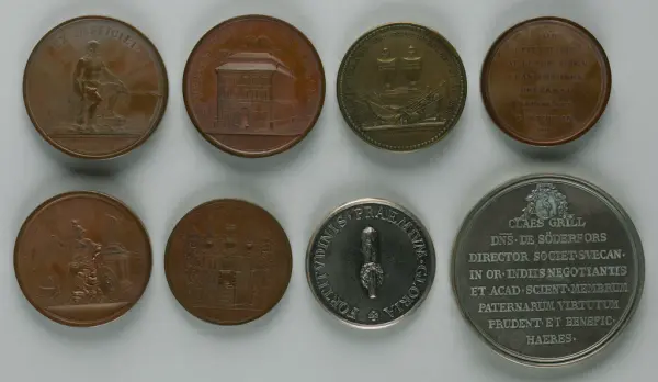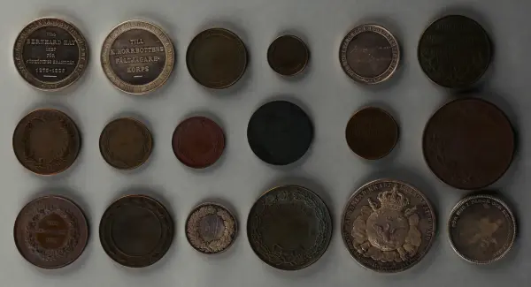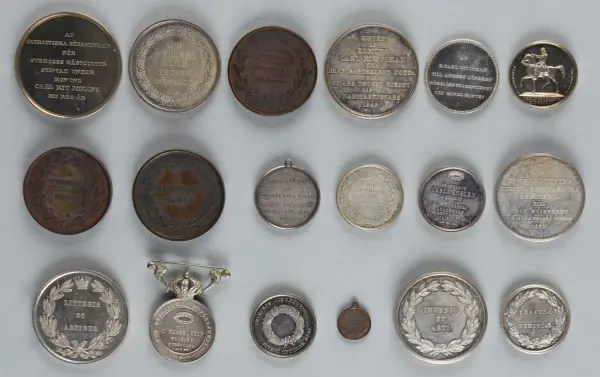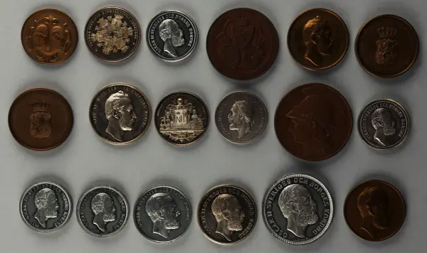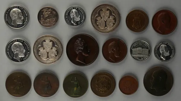 "Minnespenningar, jettoner och medaljer från 1500-1900-talet med tillhörande katalog, förvarade i skåp av fur. Gåva 8/4 1910 enl. muntligt förordnande av kapten C.A. Odelberg gm fru Elise Odelberg, Stockholm."
