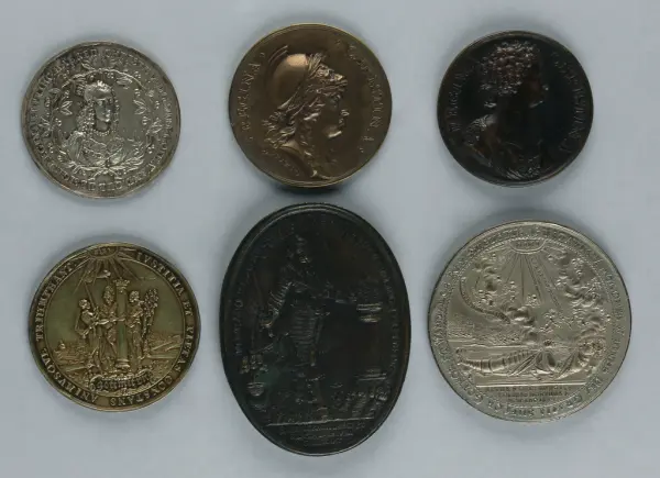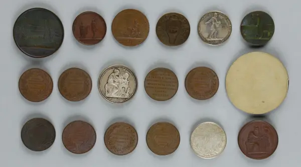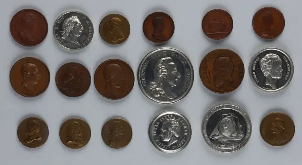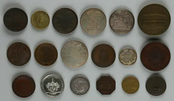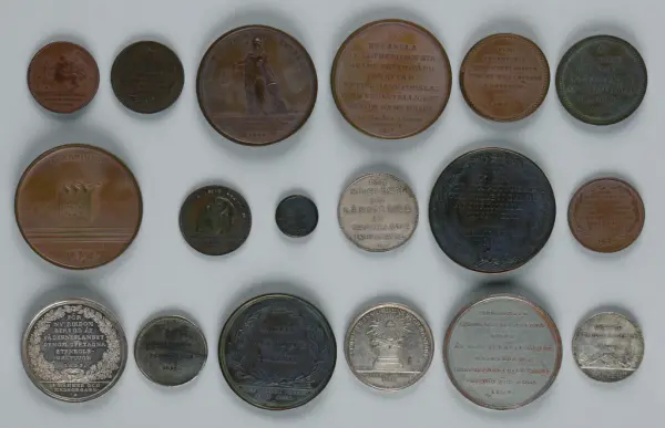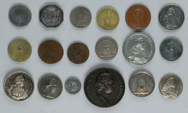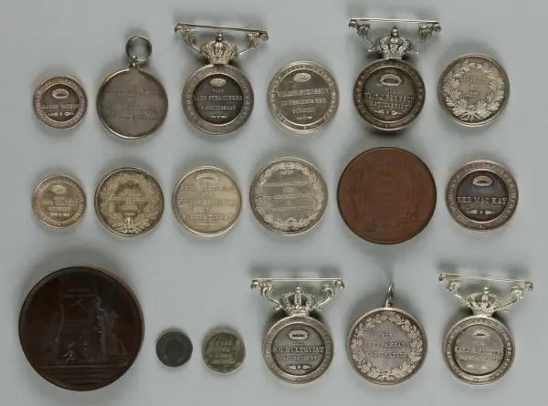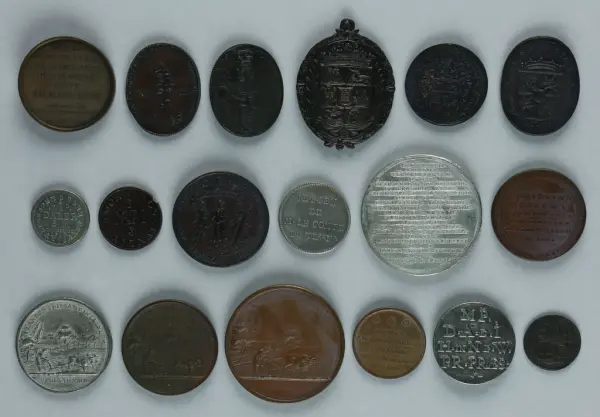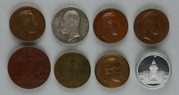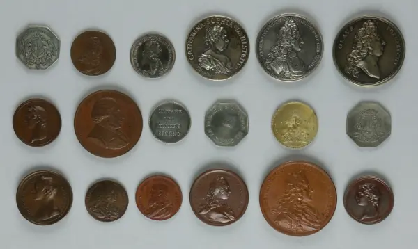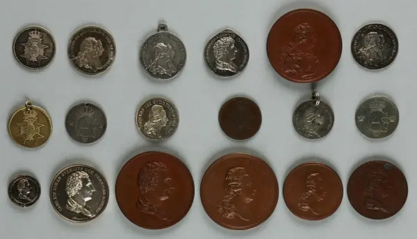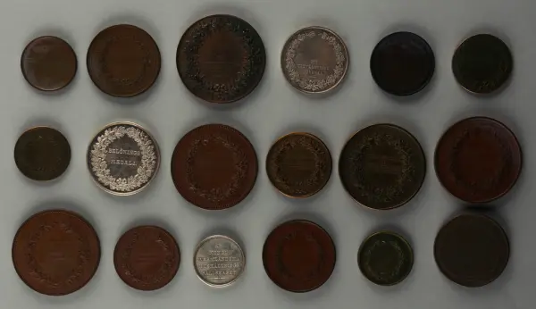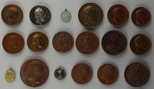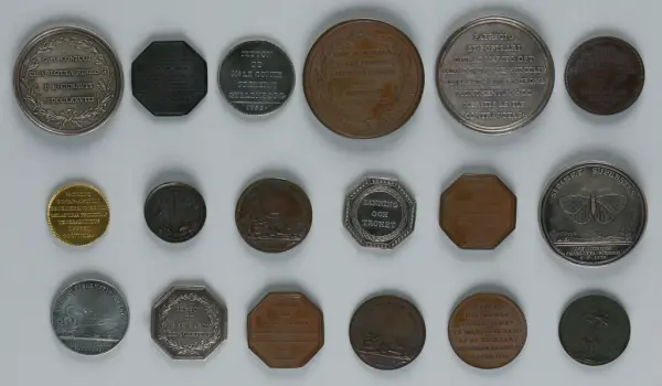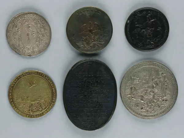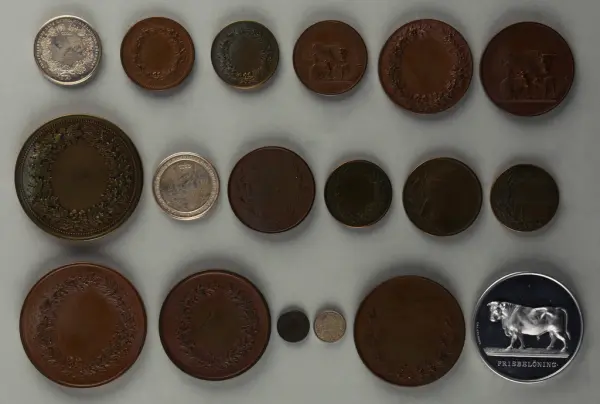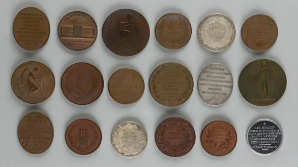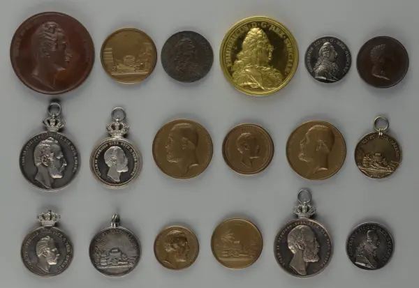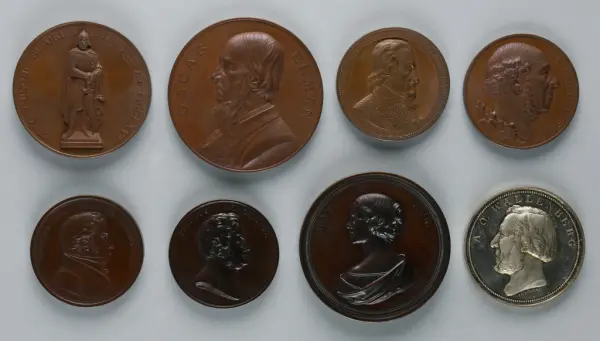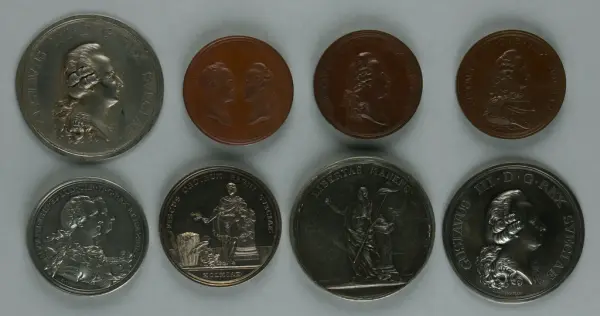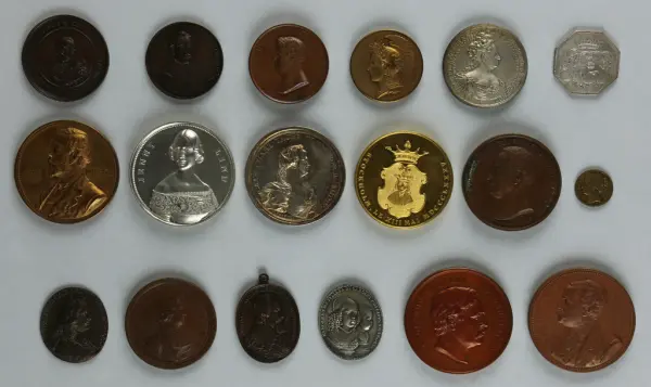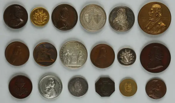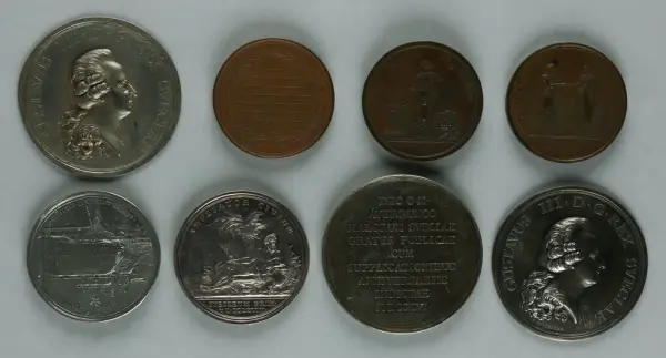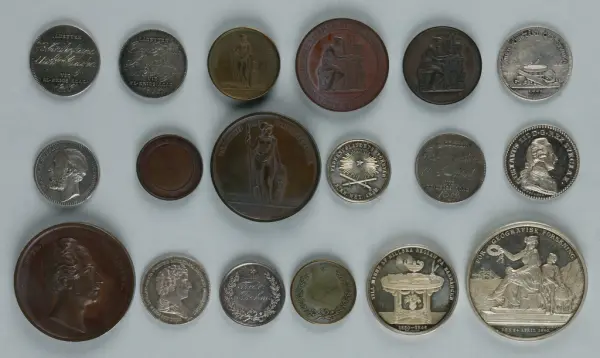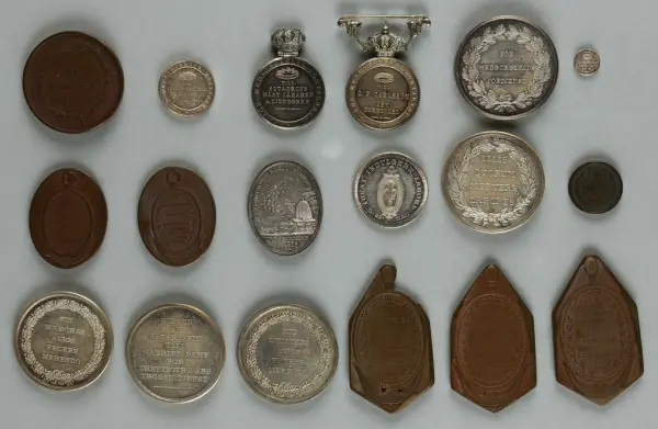 "Minnespenningar, jettoner och medaljer från 1500-1900-talet med tillhörande katalog, förvarade i skåp av fur. Gåva 8/4 1910 enl. muntligt förordnande av kapten C.A. Odelberg gm fru Elise Odelberg, Stockholm."
