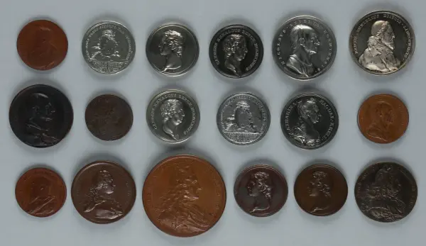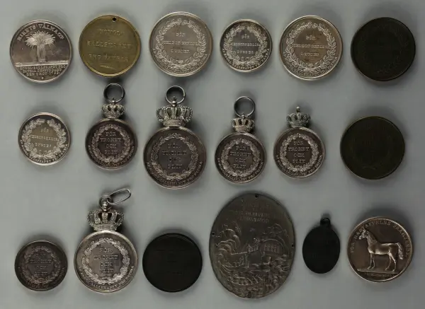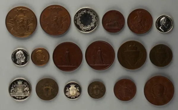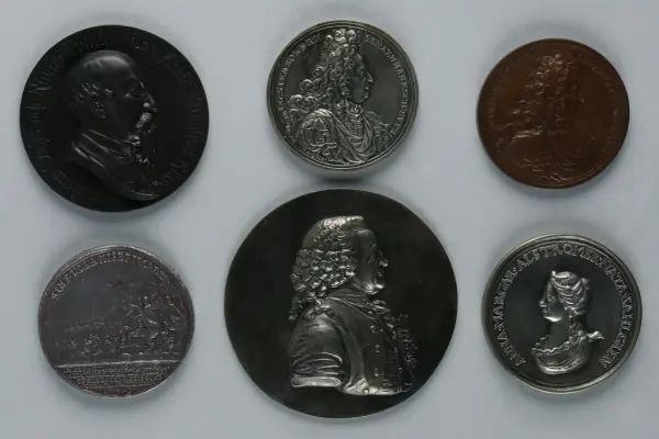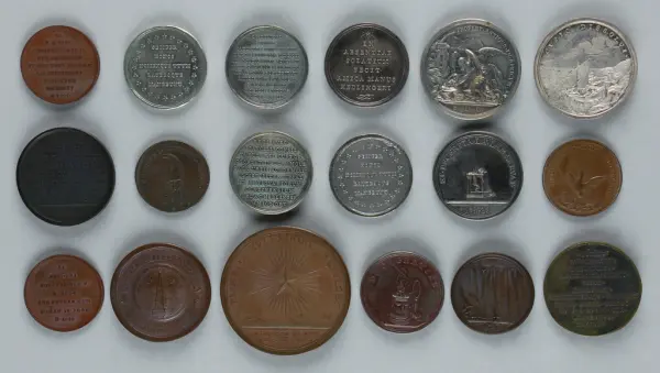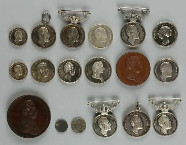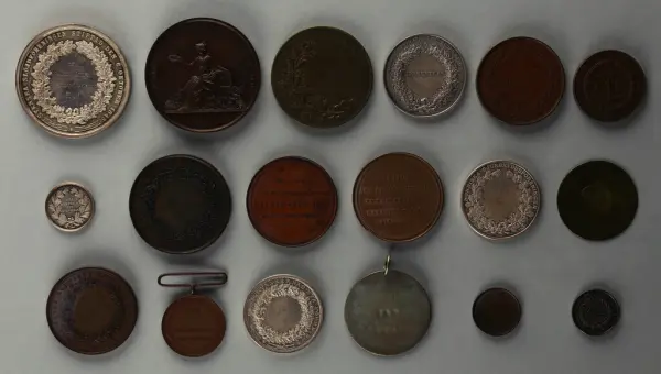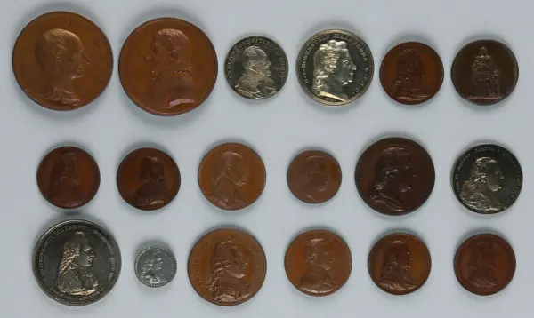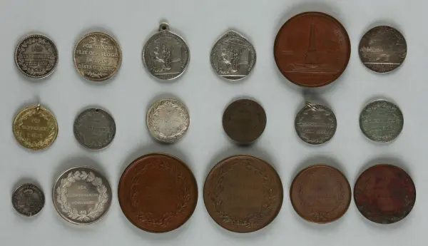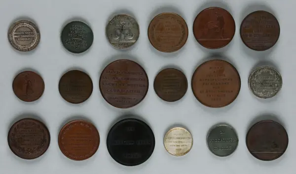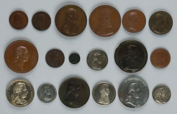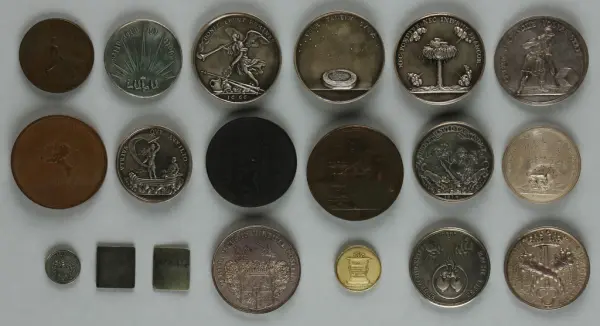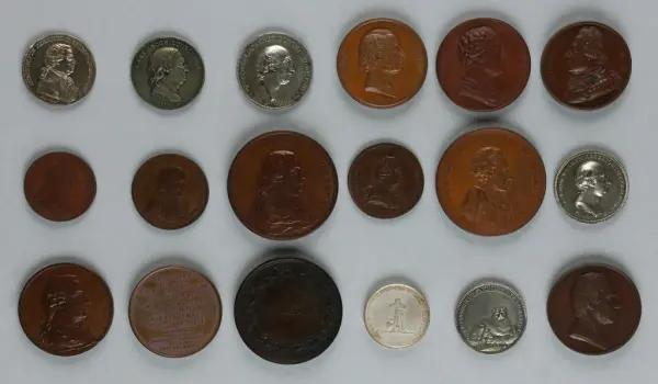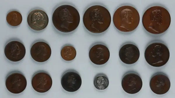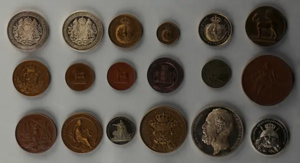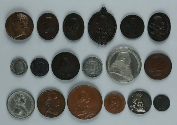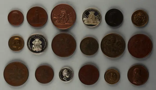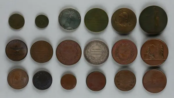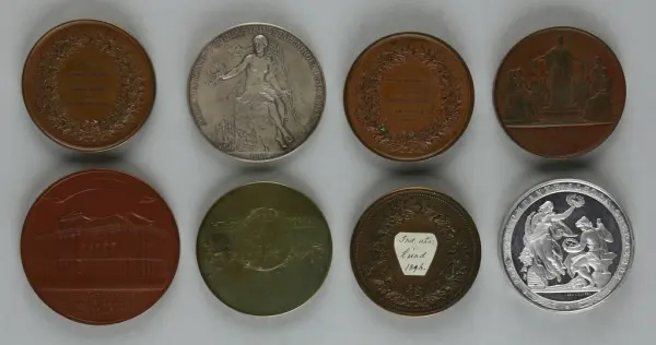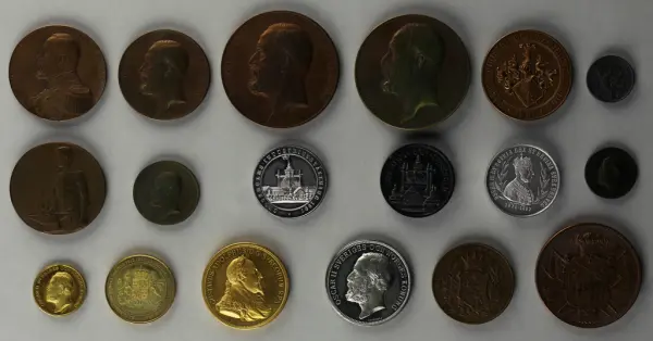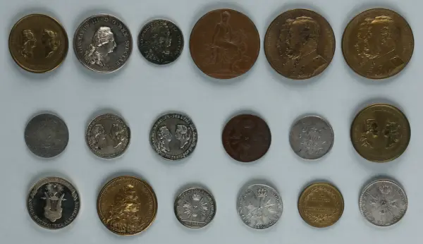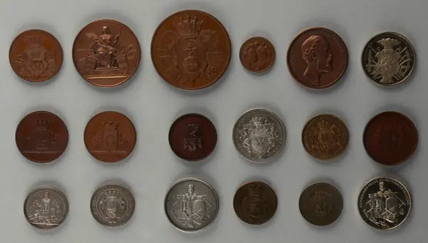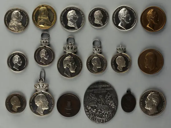 "Minnespenningar, jettoner och medaljer från 1500-1900-talet med tillhörande katalog, förvarade i skåp av fur. Gåva 8/4 1910 enl. muntligt förordnande av kapten C.A. Odelberg gm fru Elise Odelberg, Stockholm."