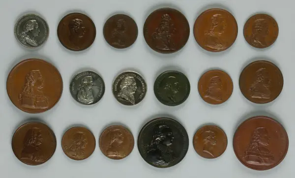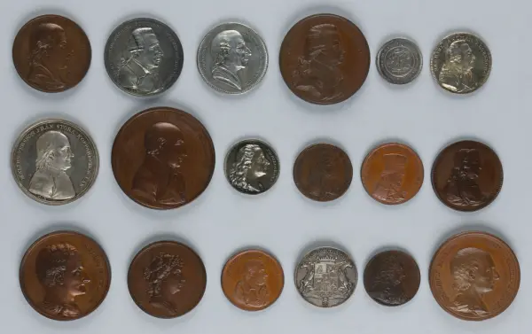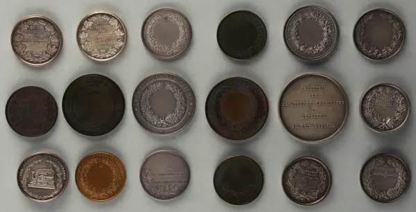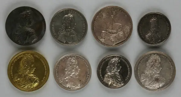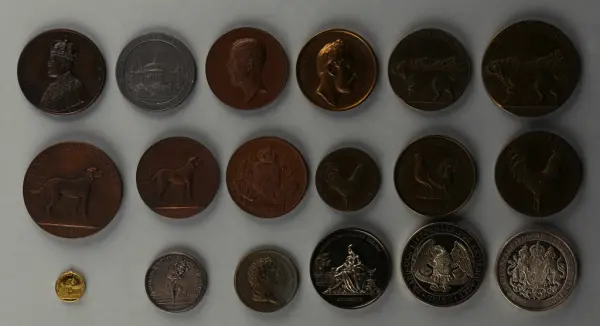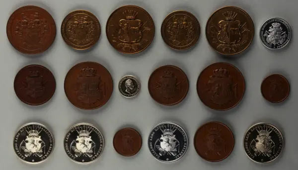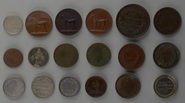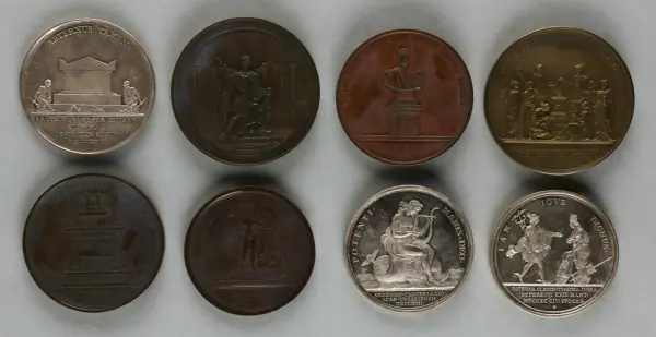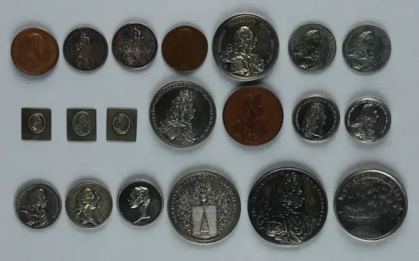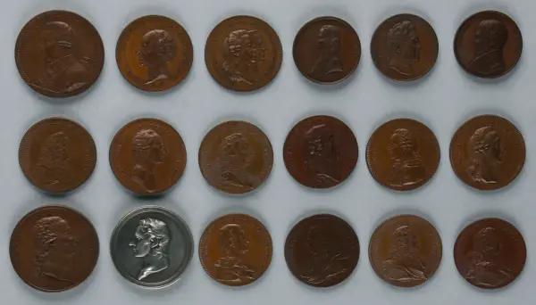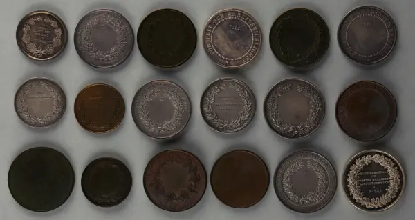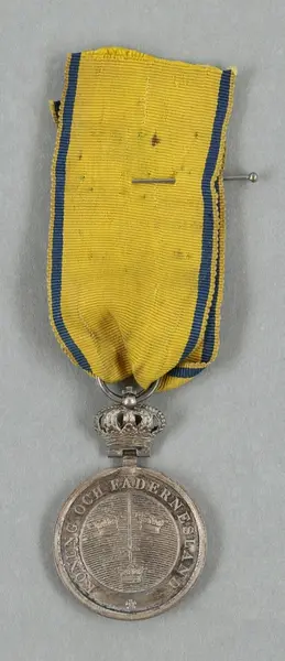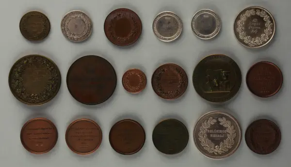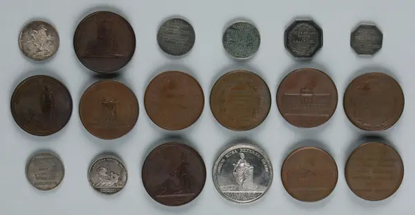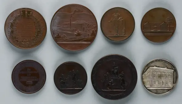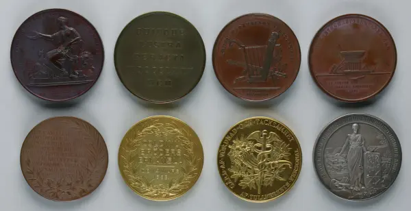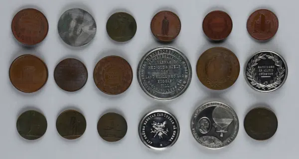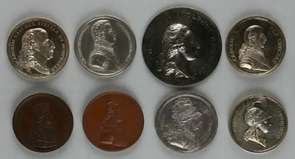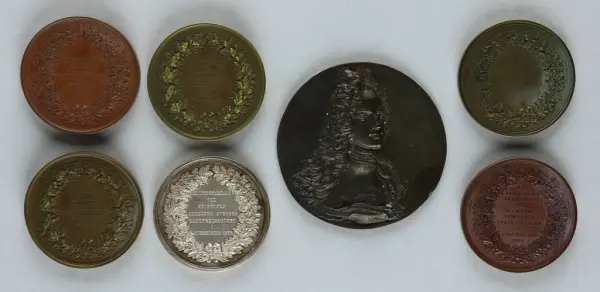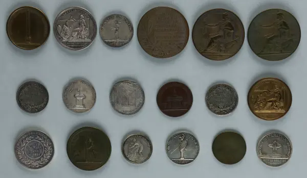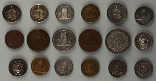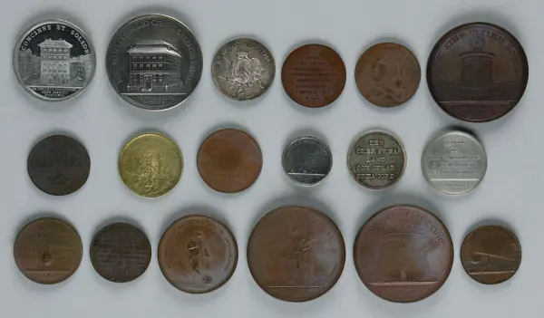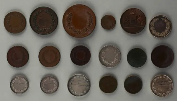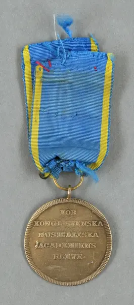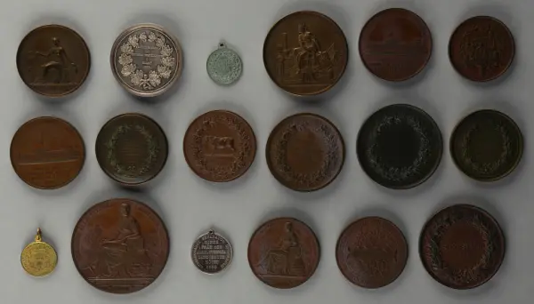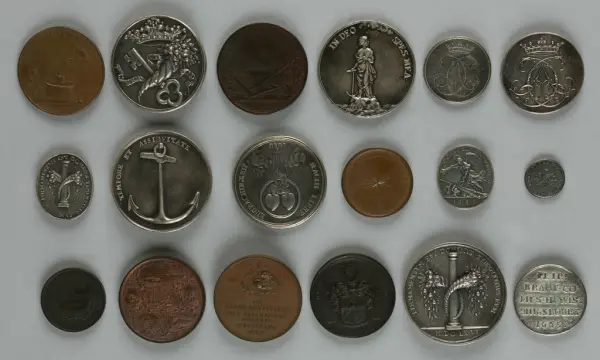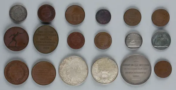 "Minnespenningar, jettoner och medaljer från 1500-1900-talet med tillhörande katalog, förvarade i skåp av fur. Gåva 8/4 1910 enl. muntligt förordnande av kapten C.A. Odelberg gm fru Elise Odelberg, Stockholm."