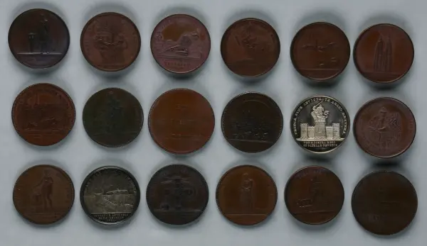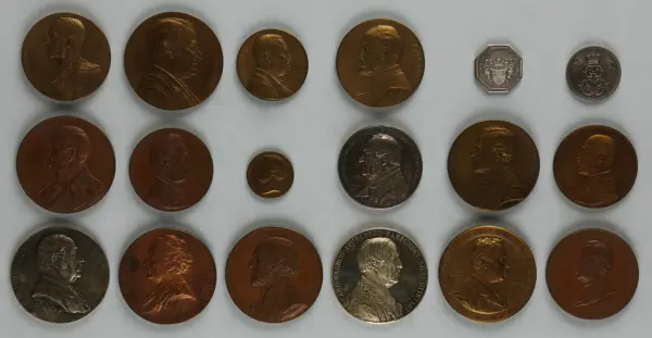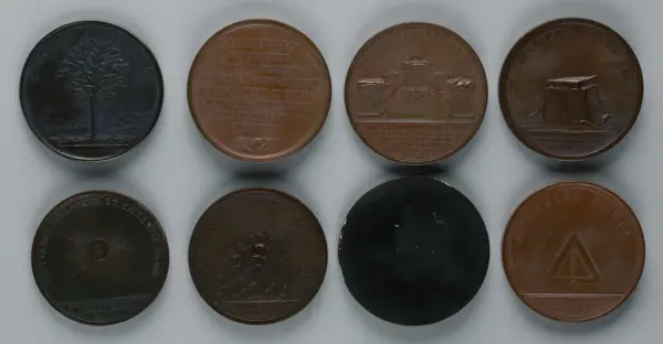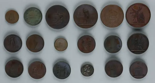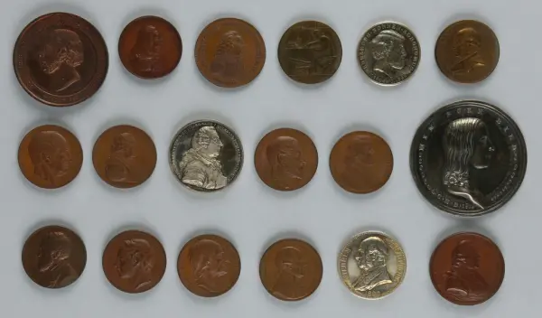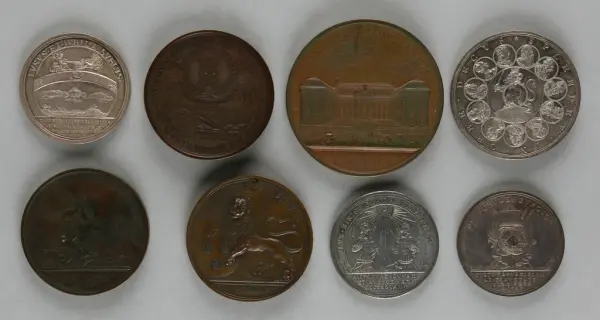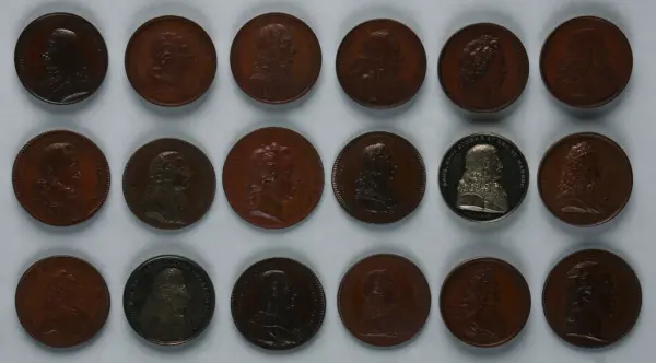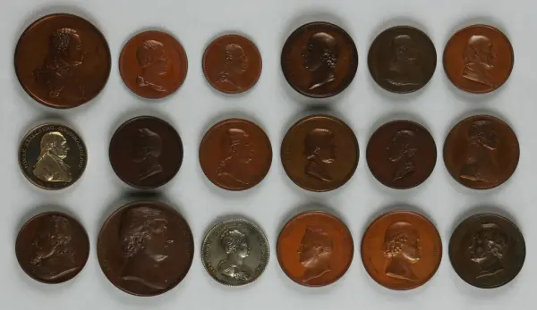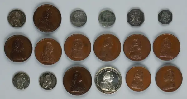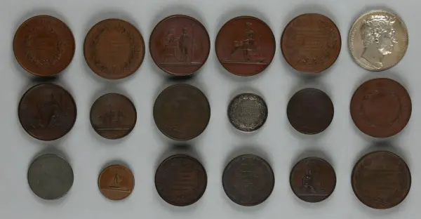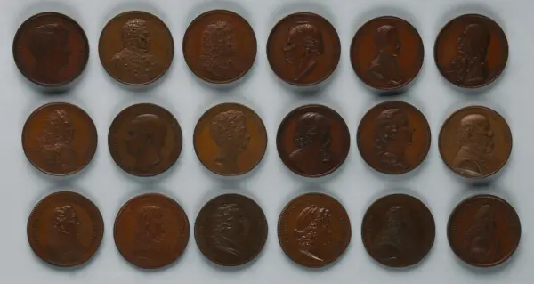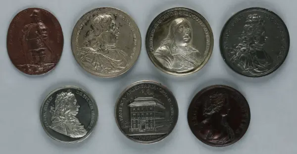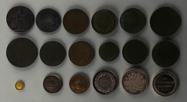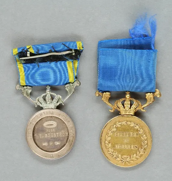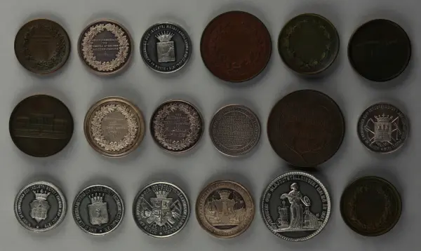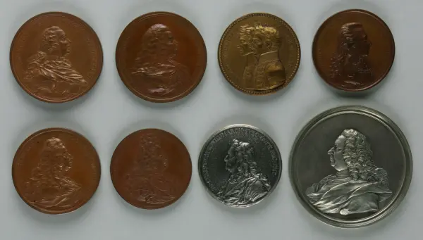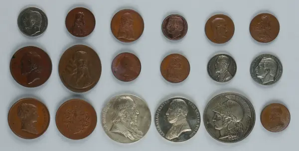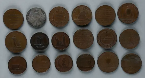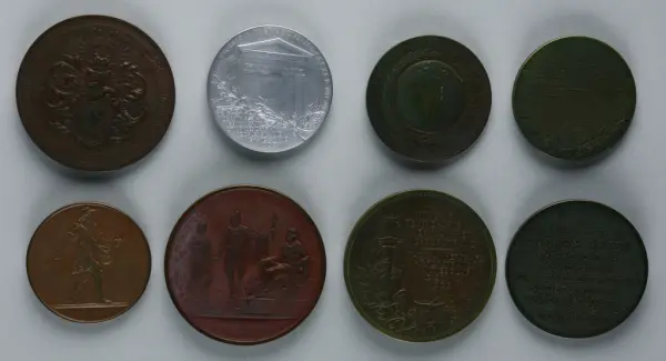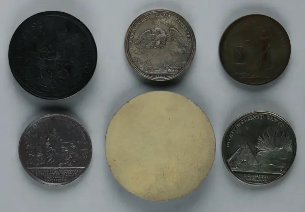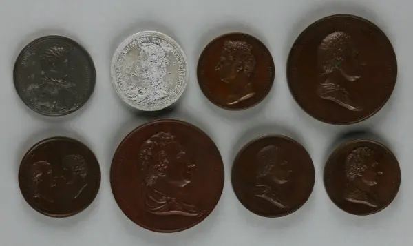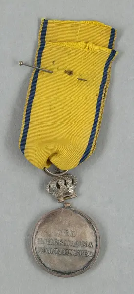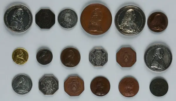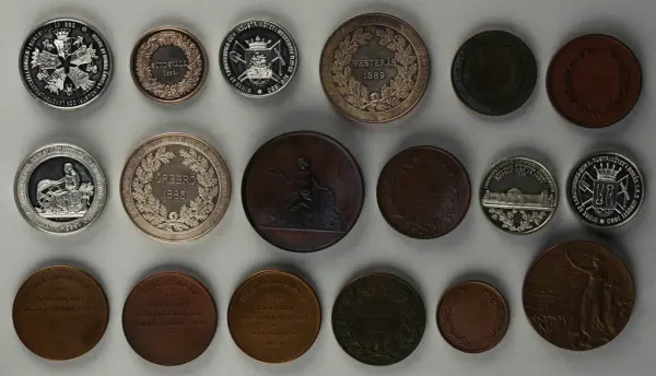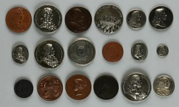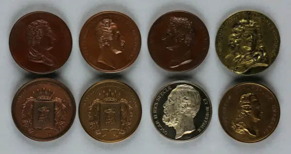 "Minnespenningar, jettoner och medaljer från 1500-1900-talet med tillhörande katalog, förvarade i skåp av fur. Gåva 8/4 1910 enl. muntligt förordnande av kapten C.A. Odelberg gm fru Elise Odelberg, Stockholm."