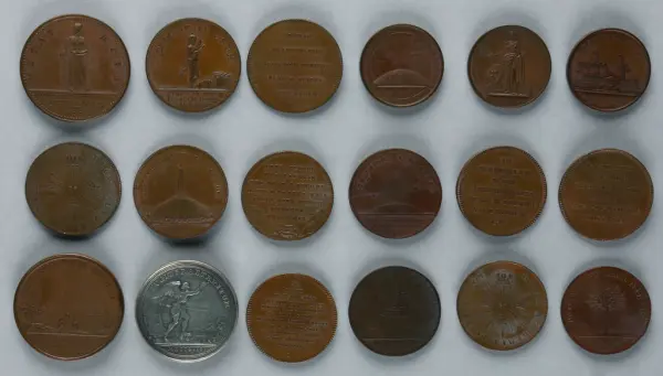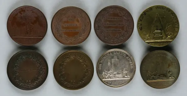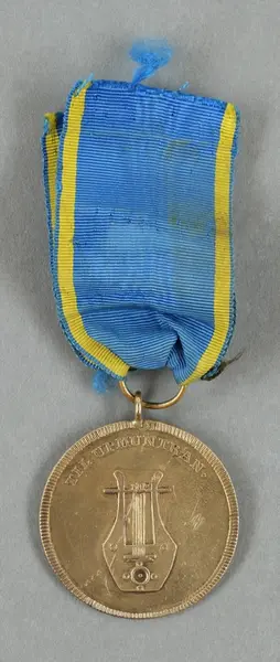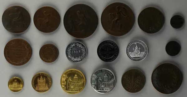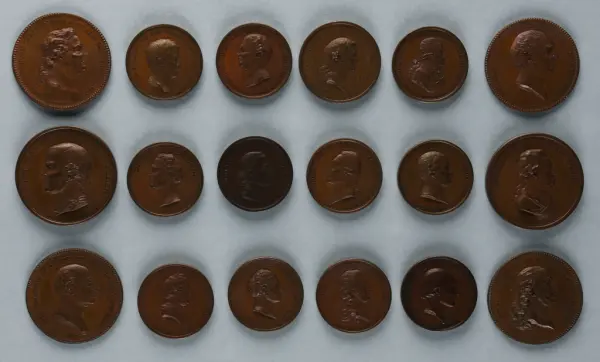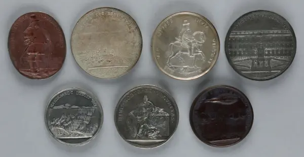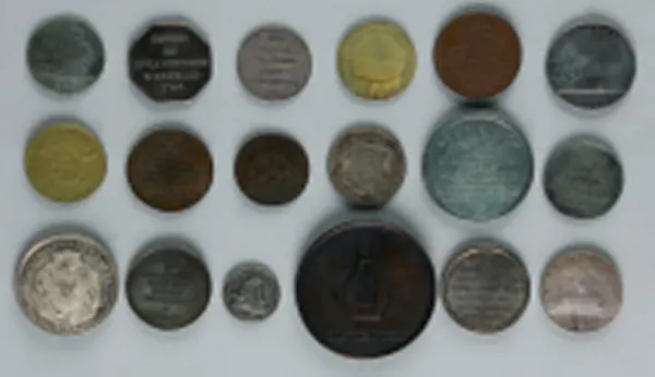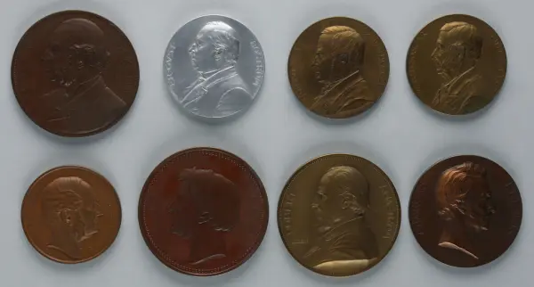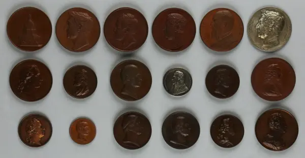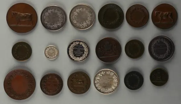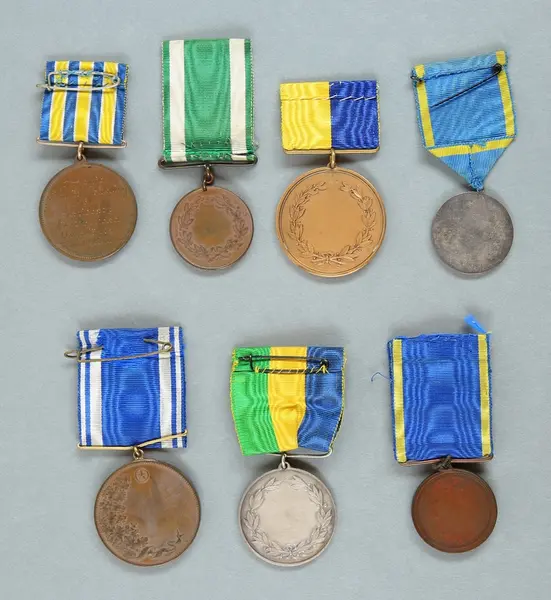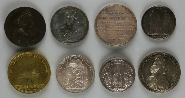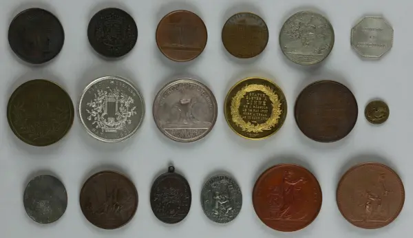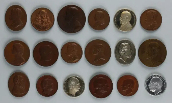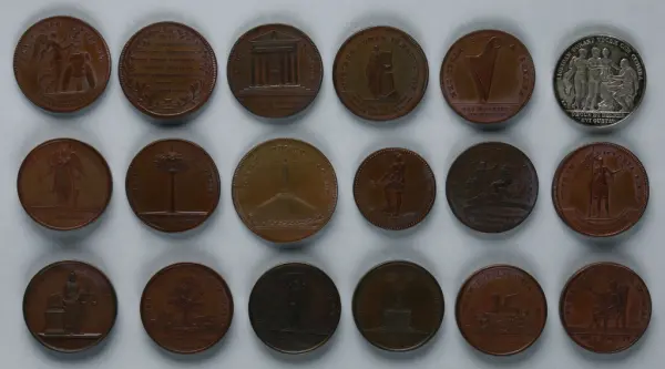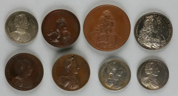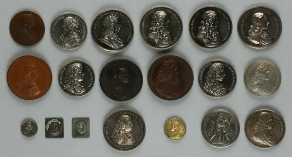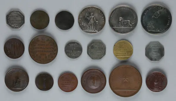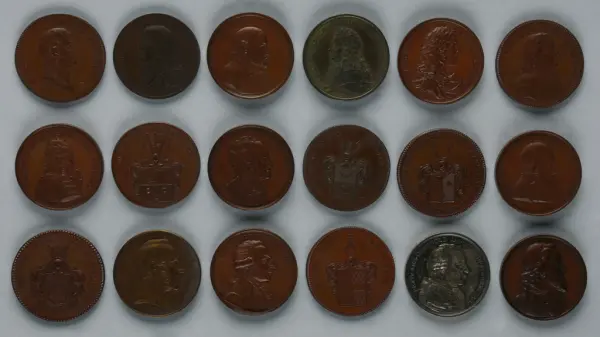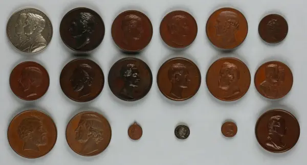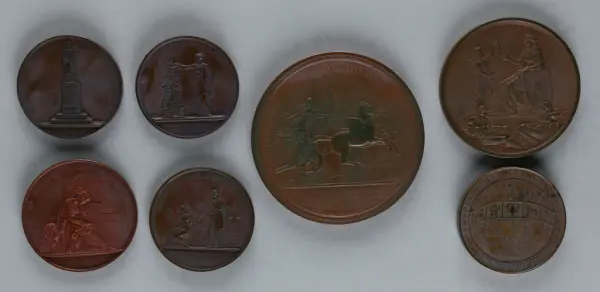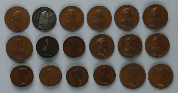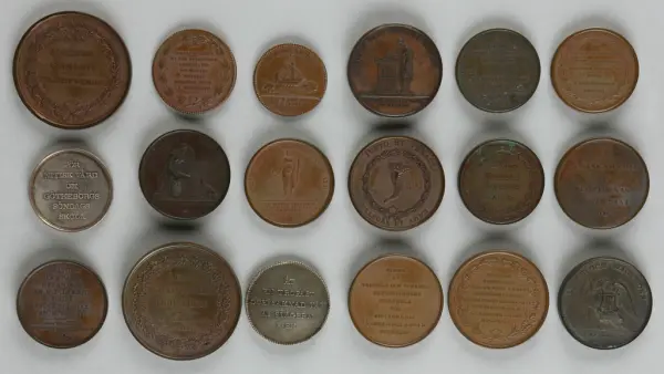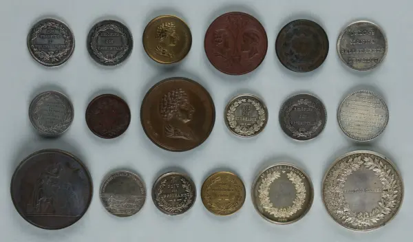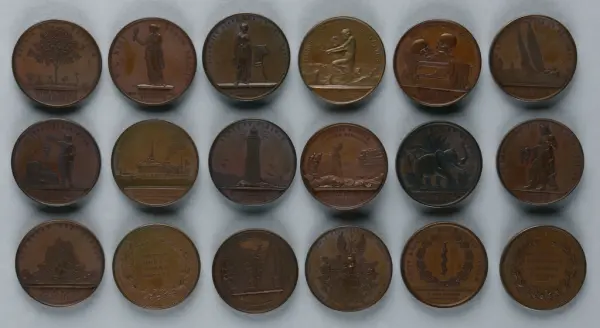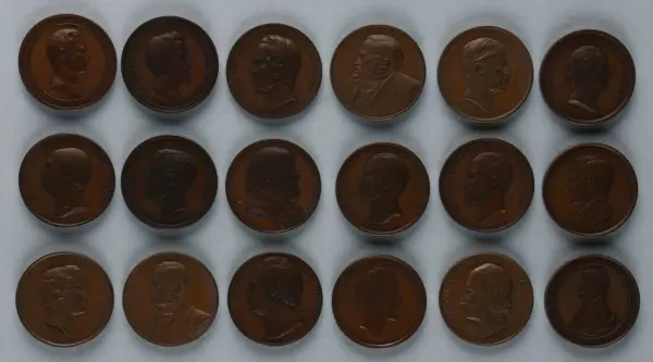 "Minnespenningar, jettoner och medaljer från 1500-1900-talet med tillhörande katalog, förvarade i skåp av fur. Gåva 8/4 1910 enl. muntligt förordnande av kapten C.A. Odelberg gm fru Elise Odelberg, Stockholm."