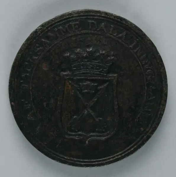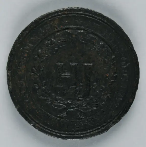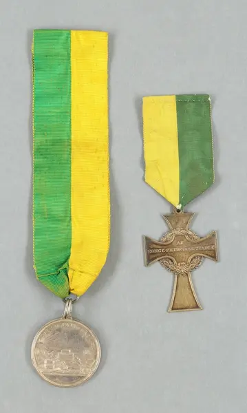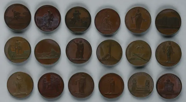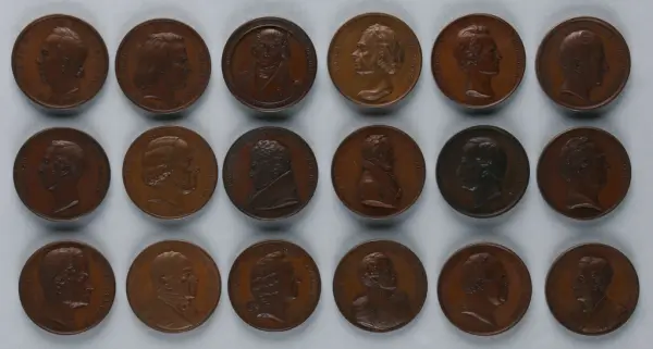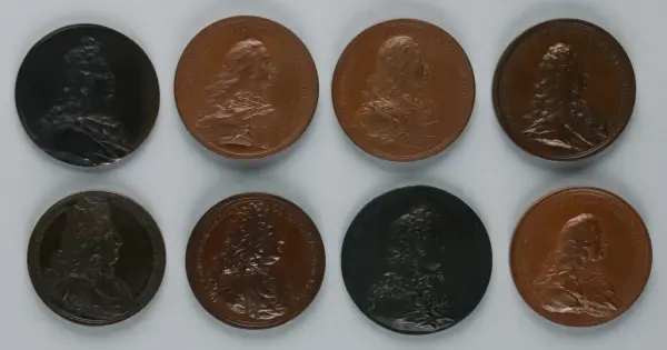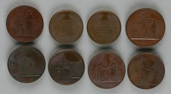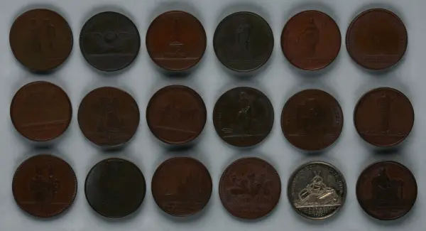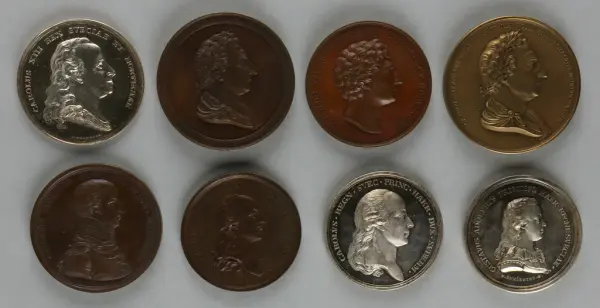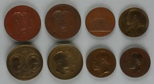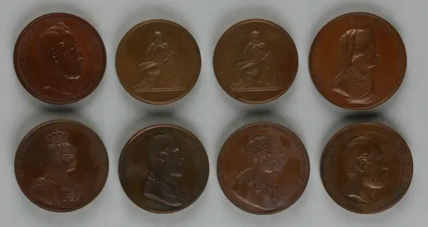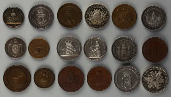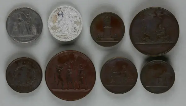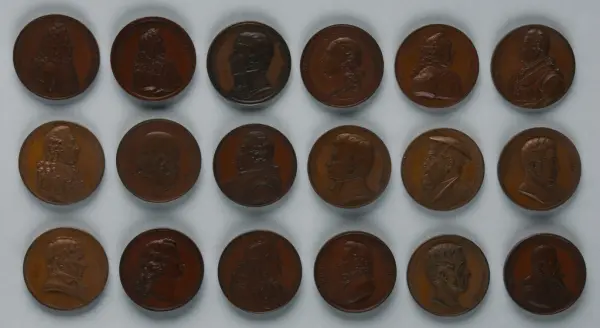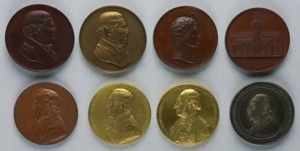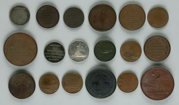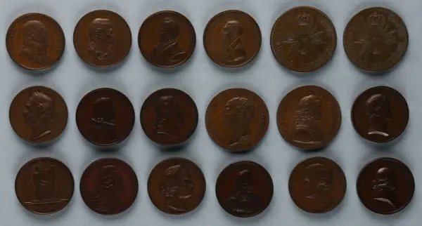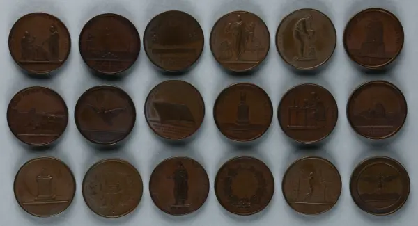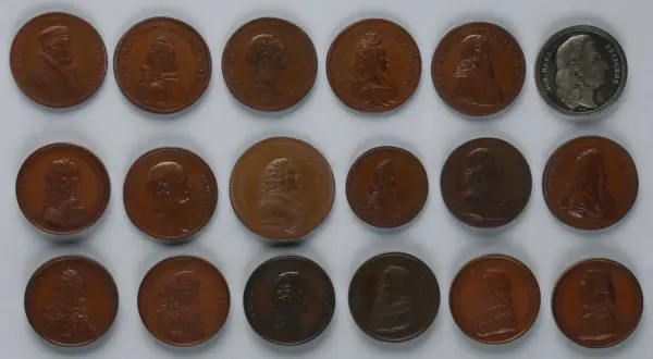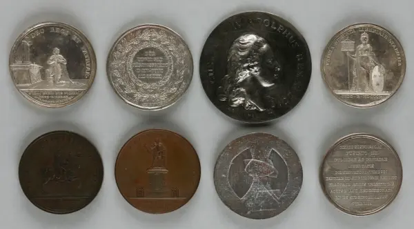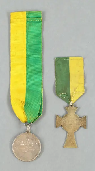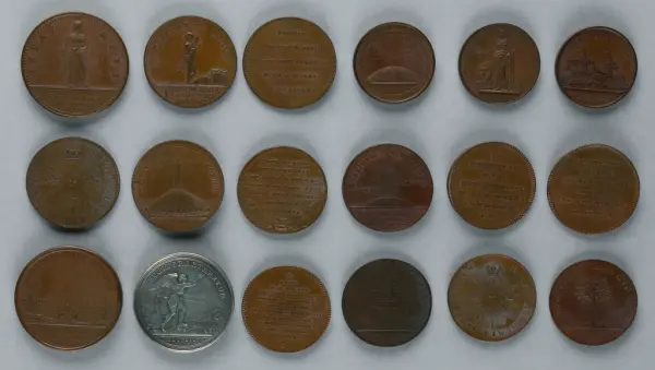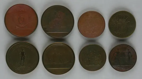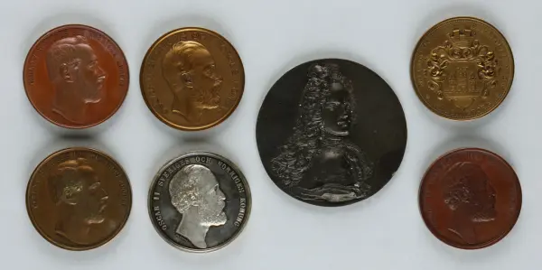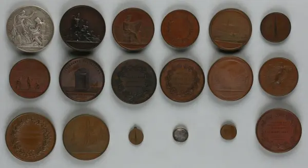"Minnespenningar, jettoner och medaljer från 1500-1900-talet med tillhörande katalog, förvarade i skåp av fur. Gåva 8/4 1910 enl. muntligt förordnande av kapten C.A. Odelberg gm fru Elise Odelberg, Stockholm."