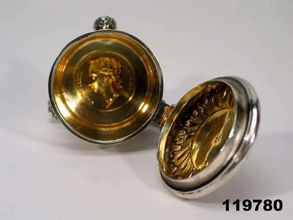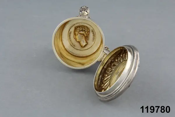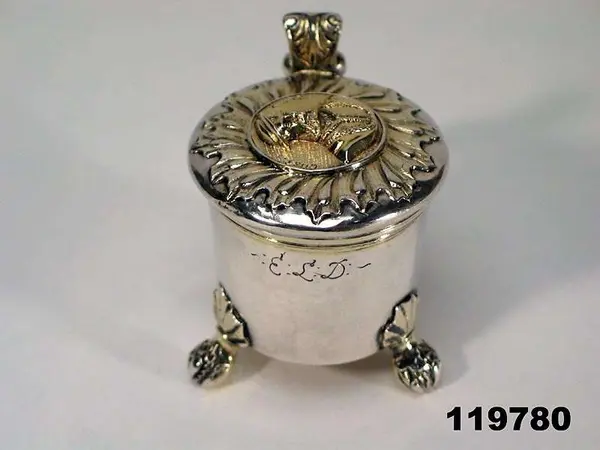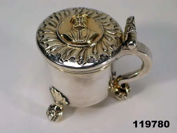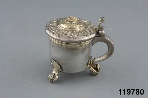 "Dryckeskanna av silver, liten, med lock och sidohandtag, på 3 kulformiga fötter, å locket Gustaf Vasas bild i relief, i botten drottning Kristinas kröningsmedalj."