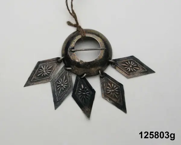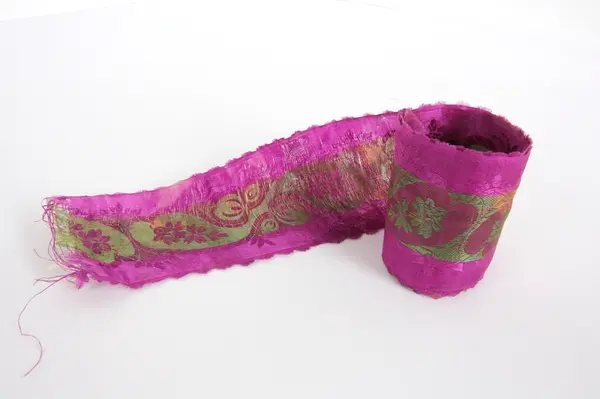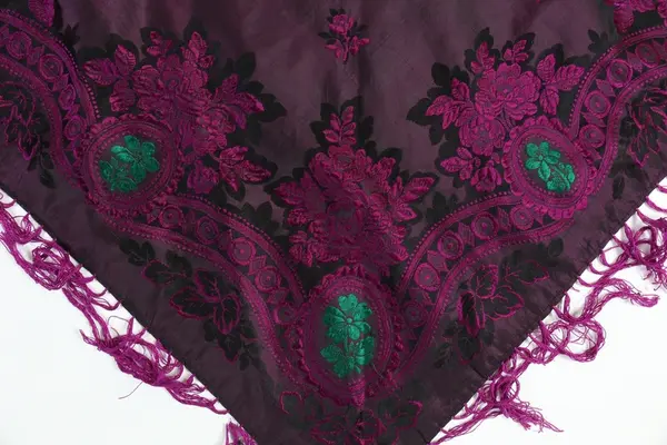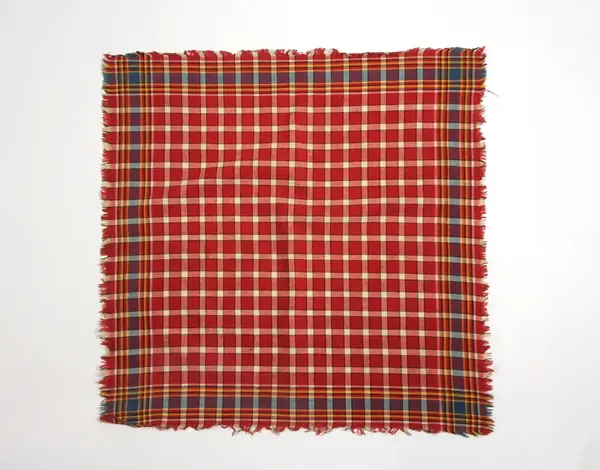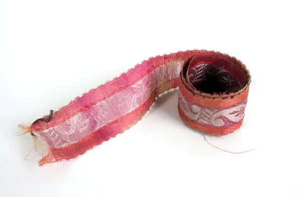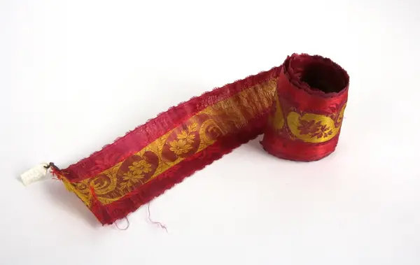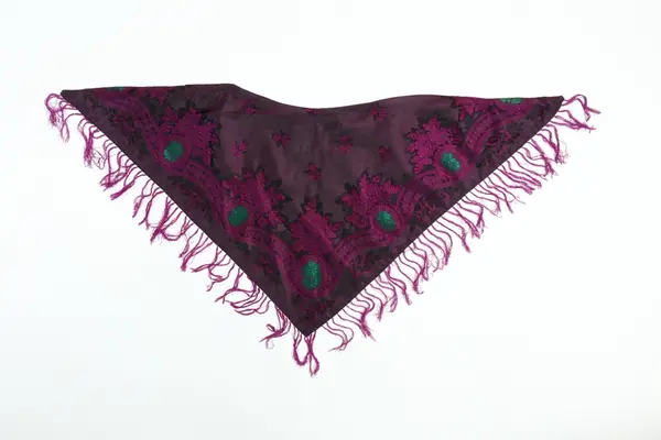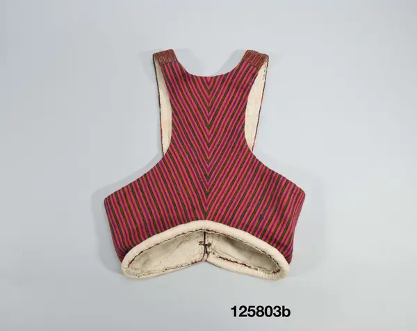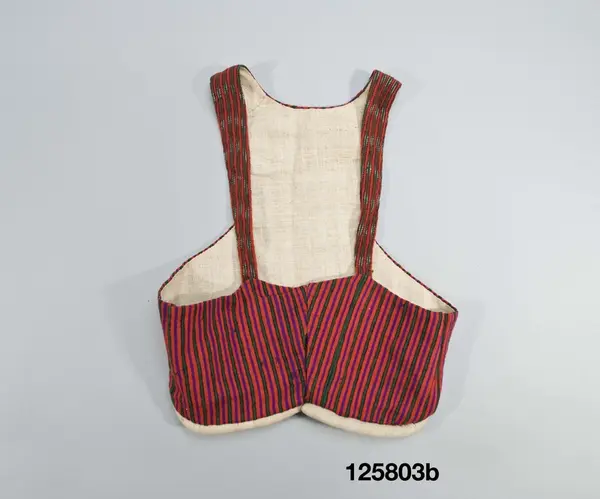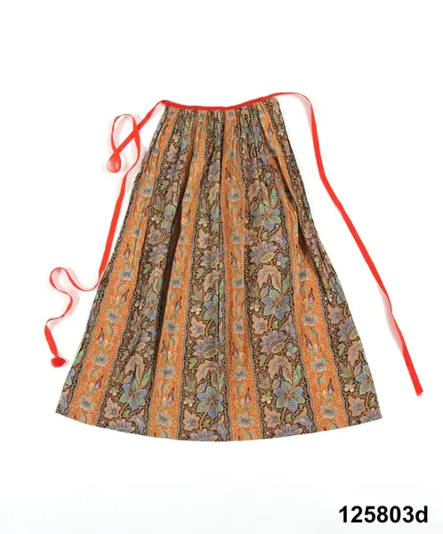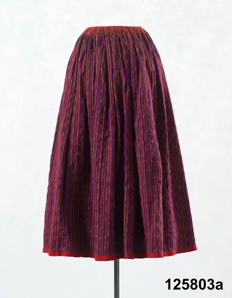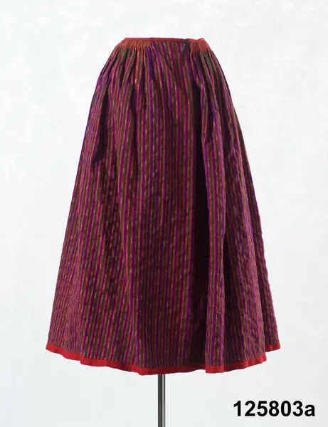"Kvinnodräkt, randig kjol, randigt liv, överdel, förkläde av katttun, huvudduk av bomullstyg, halskläde av siden, sölja av silver, 1 hårband, 4 kragband."