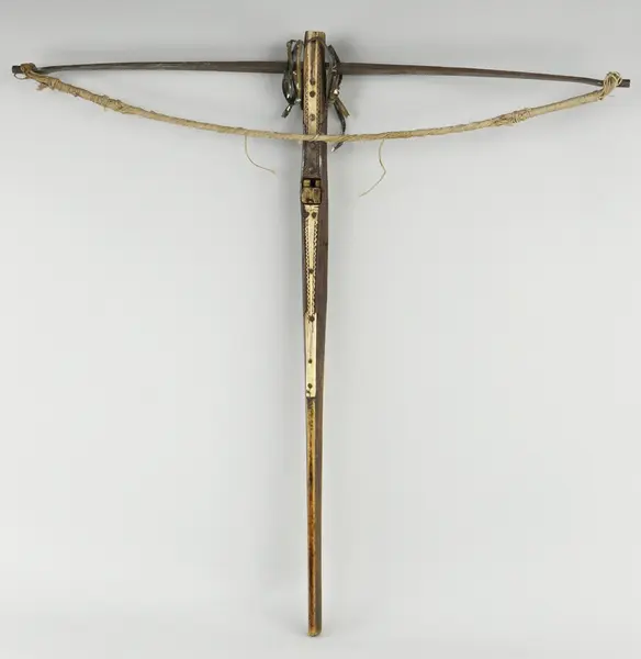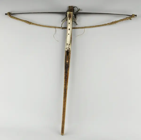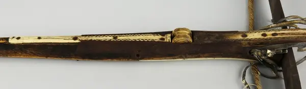 Stock av trä, båge, bygel, avtryckare av järn, pilbana, trissa, beslag av ben. Strängarna av snören. Bågen fastsurrad med nya läderband.