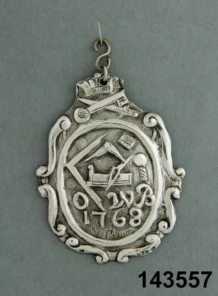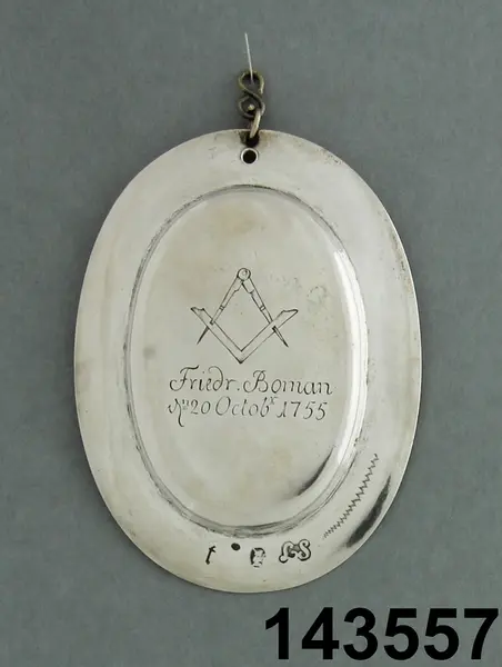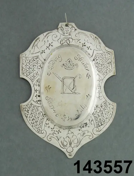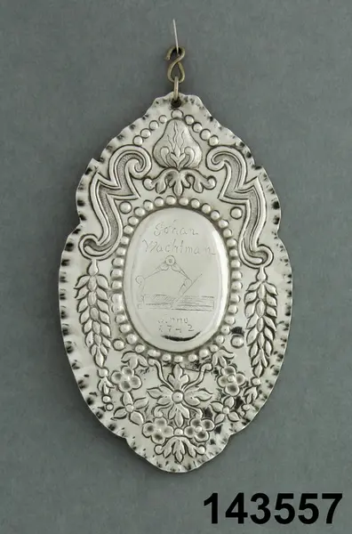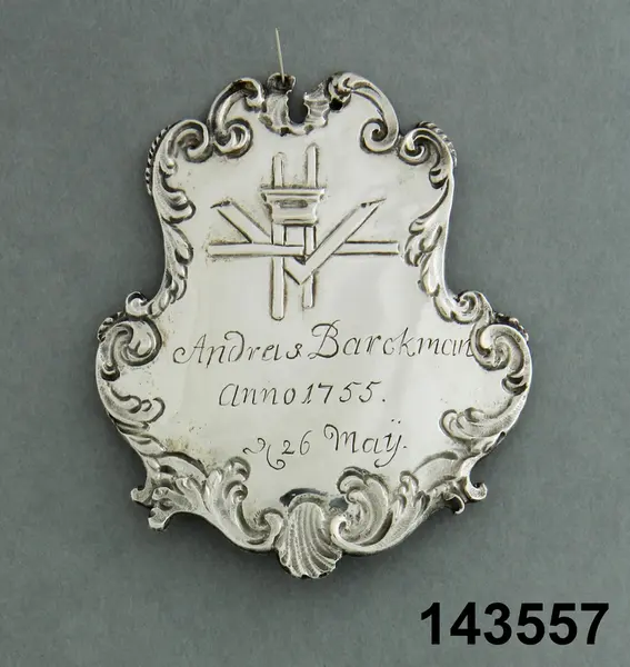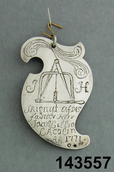 "Välkomma med trycklock, av tenn, med 6 skyltar och 5 mynt av silver. Tillhört snickarämbetet i Stockholm. dat. 1786.