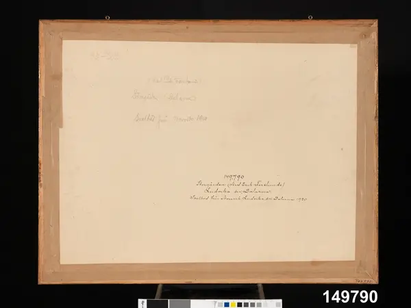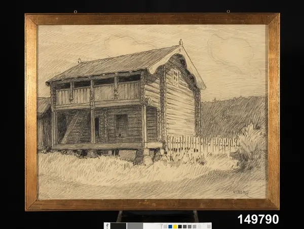 "149790. Kolteckning. Storgården (Karl Erik Forsslunds), Ludvika sn, Dalarna: Svalbod från Norrvik, Ludvika sn, Dalarna, 1920. Sign. Boberg. I förg. ekram." G[åva] Konsortiet för åstadkommande av Ferdinand Bobergs Svenska bilder från 1900-talets början"