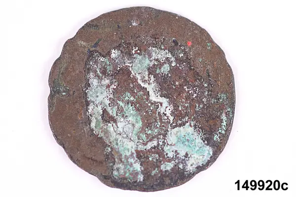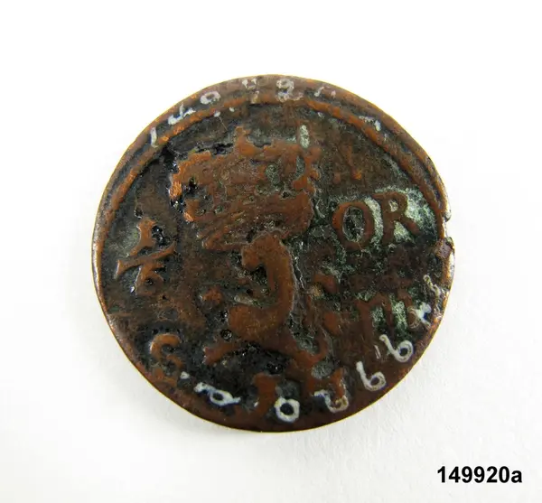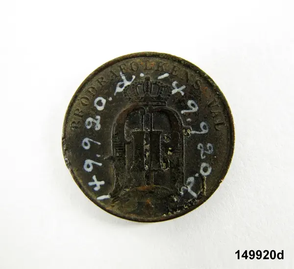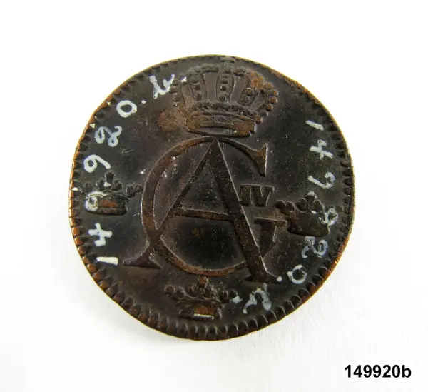 "149920a-d. 4 st. mynt av koppar, 1676, 1806, 1858 o 1881, upptagna ur Skaga offerkälla, Undenäs sn, Vadsbo hd, VG. G 31/12 1924 Herr Rickard Skogfors, Skagen, Undenäs gm aman. Louise Hagberg. Hagberg 11."
