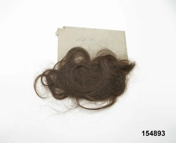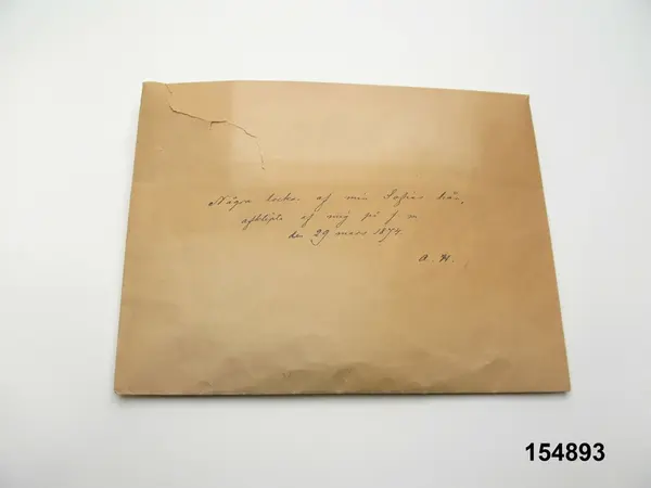 "Hårminne i större vitt kuvert m. påskrift 'Några lockar af min Sofias hår / afklipt af mig på f.m ./ den 29 mars 1874 / A. H. [=Artur Hazelius].
