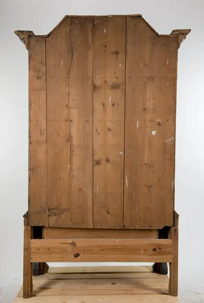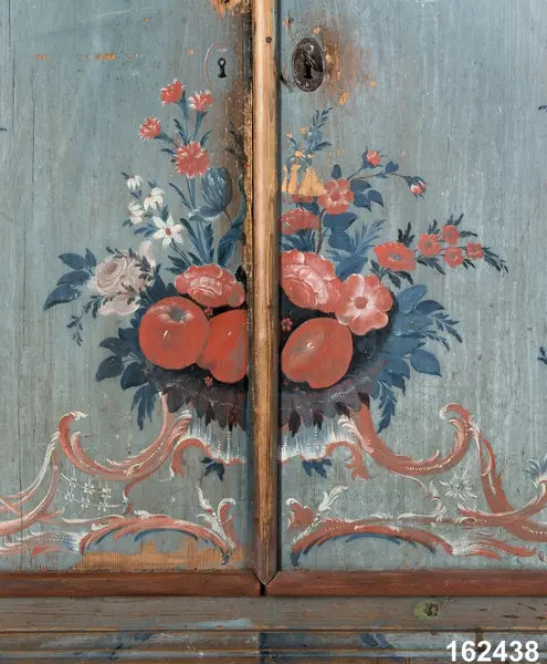 När skåpet förvärvades år 1927 var det skrivet som Jämtland och med Brunflo socken som ursprung. Senare kom det att tillskrivas Anders Berglin (1737-1805). Idag visar alldeles färsk forskning att skåpet är målat av Pehr Sundin (1760-1827) adept och sedermera konstnärskollega till Anders Berglin (Zidén & Bertilsson, Rokokomålaren Anders Berglin, 2014, s. 126). De arbetade tillsammans med läktarbarriären i Ovikens kyrka 1786. Det finns tydliga influenser av Berglins rokokomåleri i Pehr Sundins tidiga verk. Men detaljer skiljer dem åt. Sundin målade ofta sina rosor sedda underifrån och hela buketten som om man ser den snett uppifrån. Buketten kan ofta vara asymmetriskt fördelad. Berglins blomsterbuketter är mera sedda rakt framifrån och med jämvikt fördelade. Ett annat kännetecken är Sundins blommor som slingrar sig nedåt längs mittlisten på dörrparet. Sundins rocailler är också mycket tunna, glesa och flerfärgade i en annan färgskala än Berglins. Likaså skiljer sig marmoreringarna åt då Sundin är mera statisk än Berglin i sitt sätt att uttrycka sig.