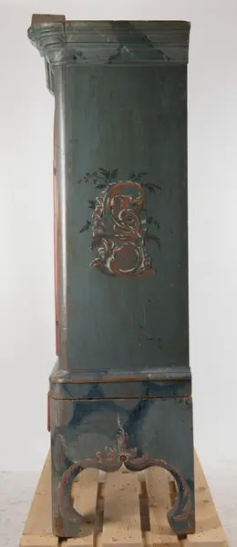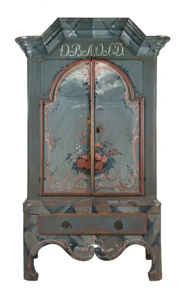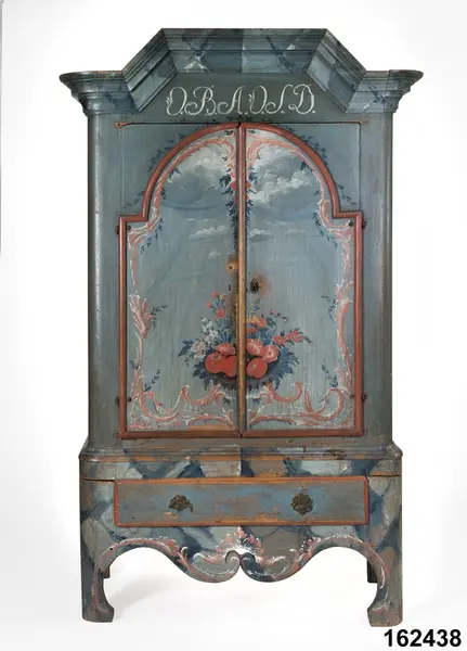 "Skåp, större, av furu m. 1 par dörrar o 1 låda, fr. Brunflo sn. Jämtl. Rokokoorner. mot blågrå grund. OBA OSD, på 4 ben. I. Anthandl. NM Åmell, Sthlm. 9/5 1927."
