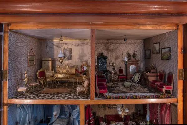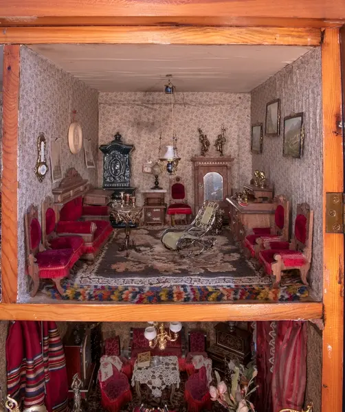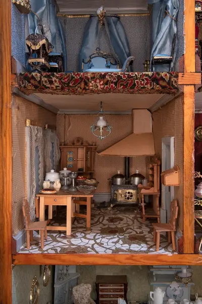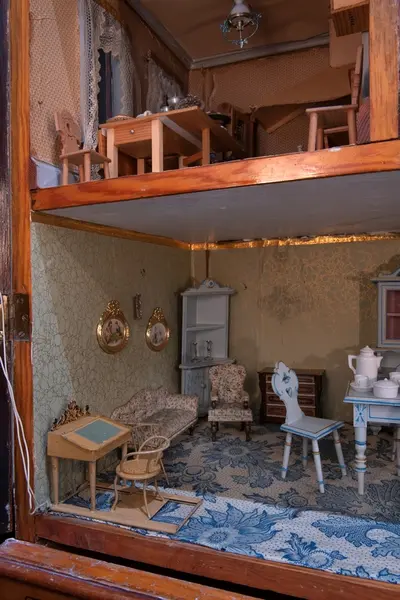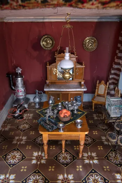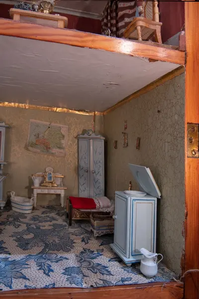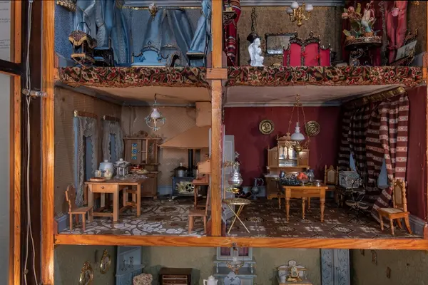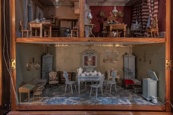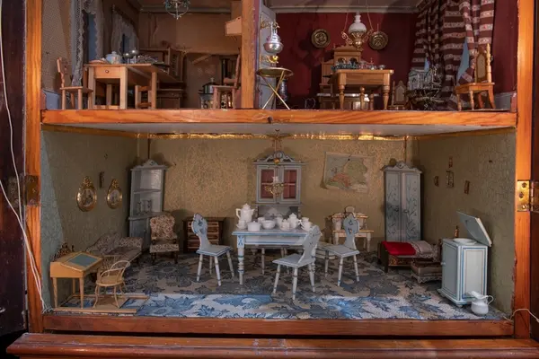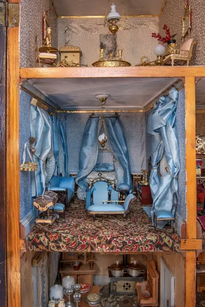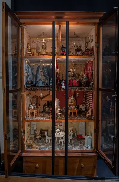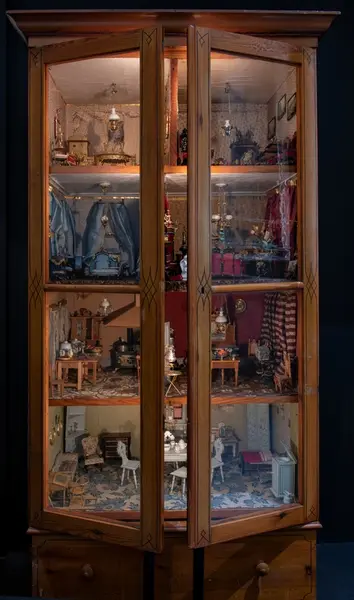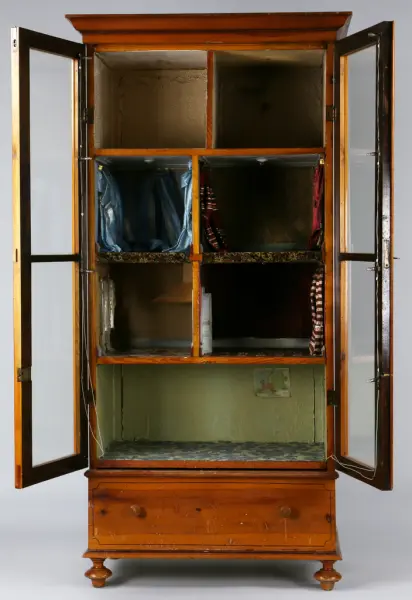 Dockskåp av brunbetsat furu. Skåp med ett par glasdörrar med brun dekorrand på ramarna, undertill en låda med två dragknoppar, rakt krön med profilerad list. Skåpet står på fyra kulfötter. Dörrparet med lås och nyckel. På gavlarna 4 st fönster på vardera sidan. I skåpet 4 st våningar med sammanlagt 7 rum. Samtliga rum med mönstrade papperstapeter och krok i taket för lampa.