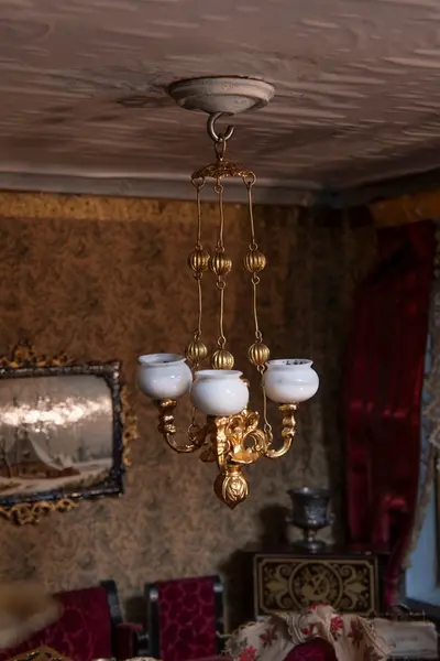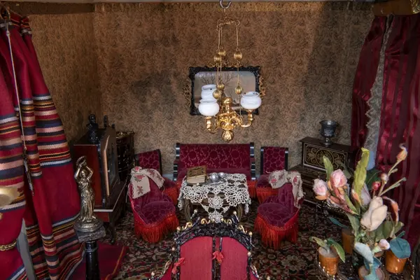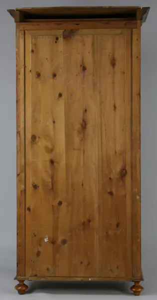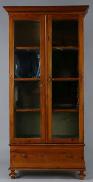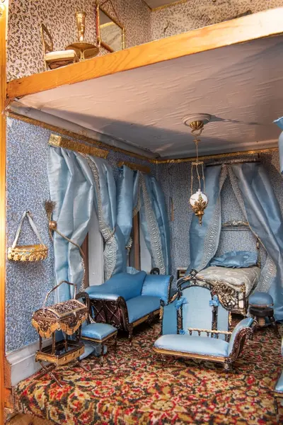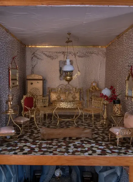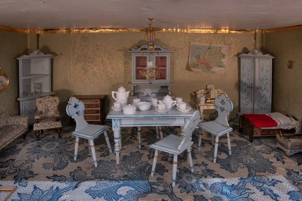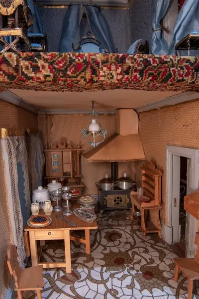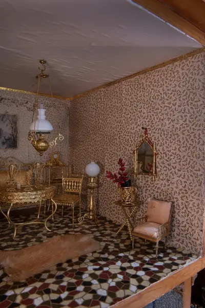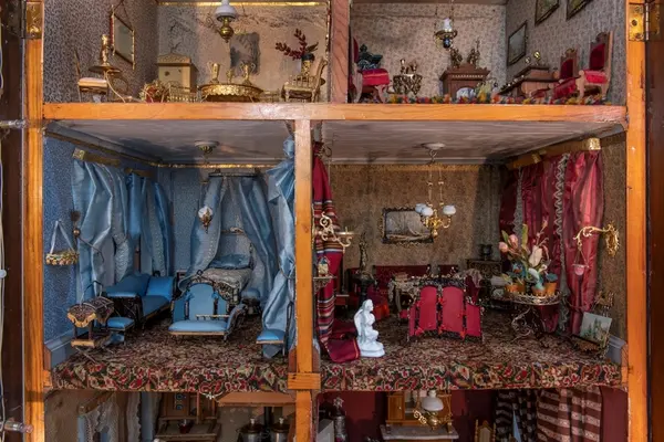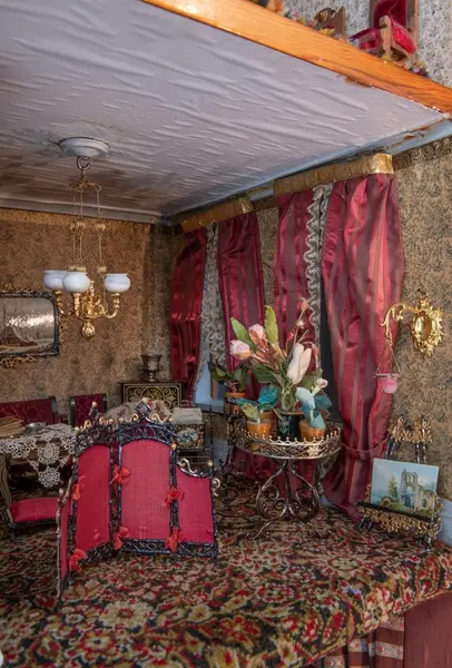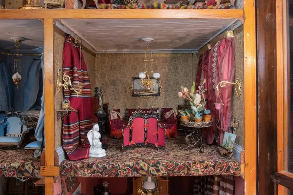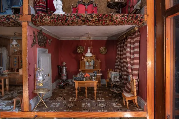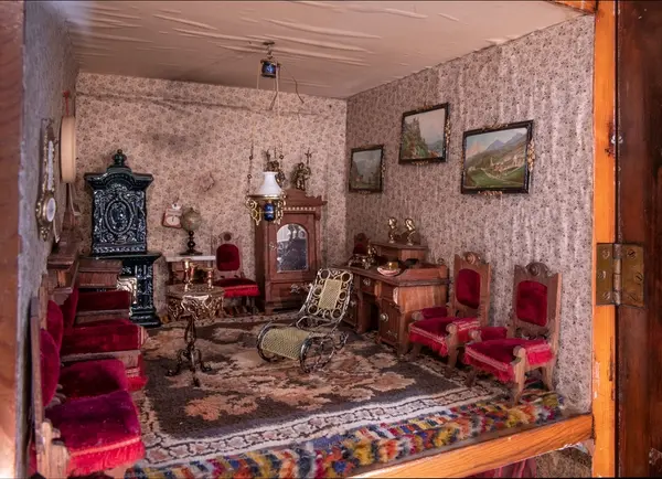 Dockskåp av brunbetsat furu. Skåp med ett par glasdörrar med brun dekorrand på ramarna, undertill en låda med två dragknoppar, rakt krön med profilerad list. Skåpet står på fyra kulfötter. Dörrparet med lås och nyckel. På gavlarna 4 st fönster på vardera sidan. I skåpet 4 st våningar med sammanlagt 7 rum. Samtliga rum med mönstrade papperstapeter och krok i taket för lampa.