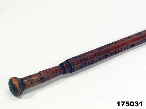 "Runkalender av trä, 8-kantig stav, dat. 1647. D[eposition] 1928 [av] Statens Historiska museum. [Statens Historiska museums numrering] 11."