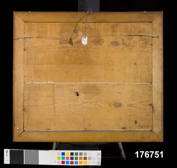 "Tavla, kistebrev. 1844-57. Lito hos P.A. Huldberg, Sth. Färglotografi. Osignerad. Bladet visasr Sveriges 18 regenter från Gustav Vasa till Oskar I. Var och en inskriven i en ram med namnet textat nedtill. Bladet är märkt No 130 i nedre vä. hörnet. Slät ram, troligen alm. Tillstånd: mindre veck och fuktskador. Ink. 18/6 1909. [19]76 K.L [= Kjell Löfgren]"