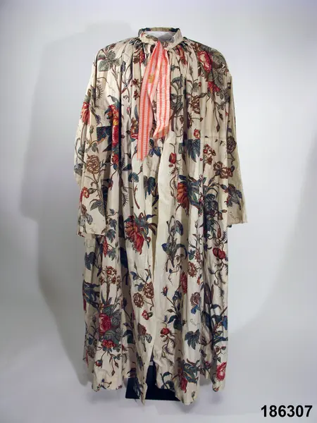 Hellång rock vilken avvänts som morgonrock eller nattrock. Den är sydd av bomullstyg med ett tryckt blommigt mönser efter indisk förebild, kattun. Rocken har ett löst och ledigt snitt, sydd av raka tygstycken som rynkats samman vid halslinningen, vilken knyts ihop med ett rosarandigt sidenband.