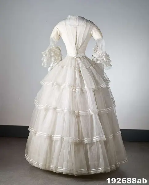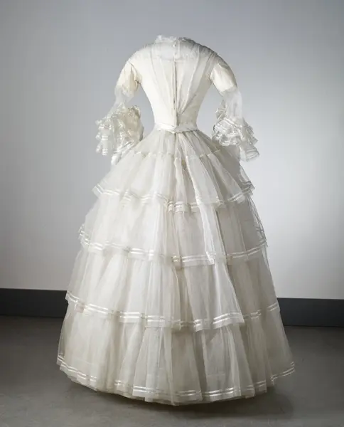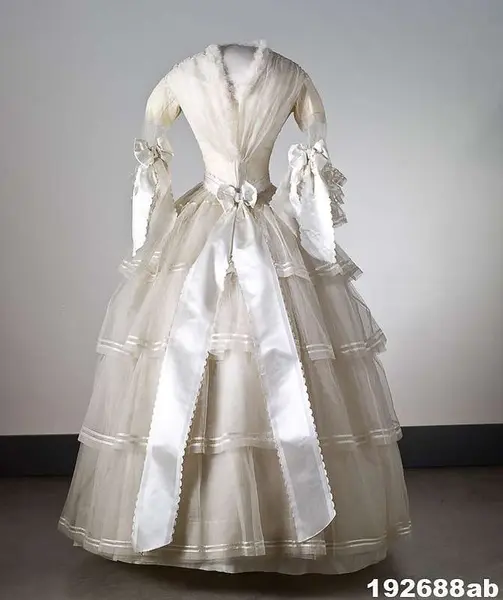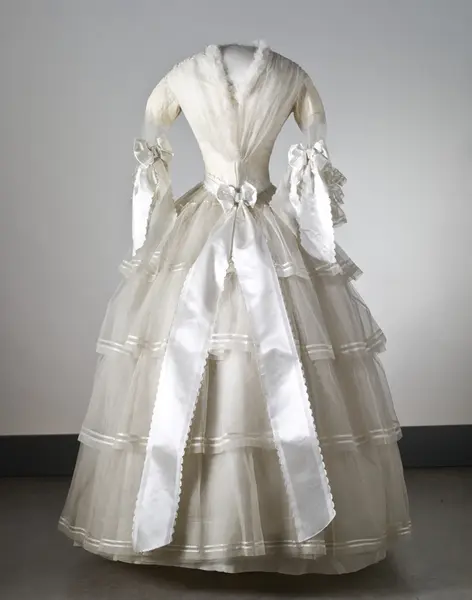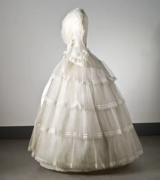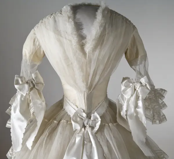 "Brudklänning, liv med fastsydd kjol, vit tarlatan, garnerad med vita sidenband, rosetter.